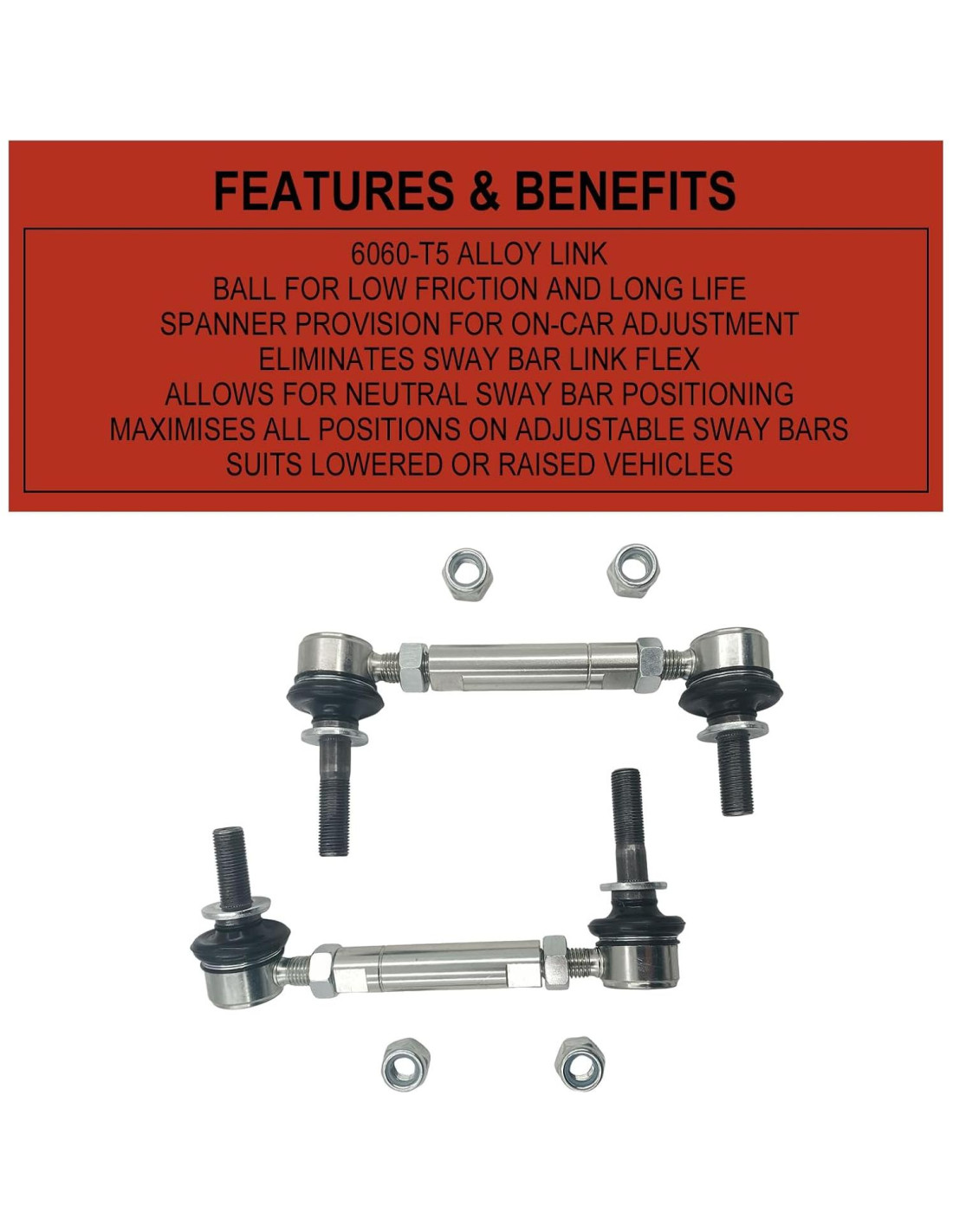- Gran Rendimiento: Elimina la flexibilidad no deseada en los enlaces de la barra estabilizadora, facilita la posición neutral de la barra estabilizadora y maximiza el rango de ajuste en las barras estabilizadoras ajustables. Nuestro kit de enlace de barra estabilizadora frontal es perfecto para vehículos con altura de suelo alterada, ya sea rebajada o elevada.
