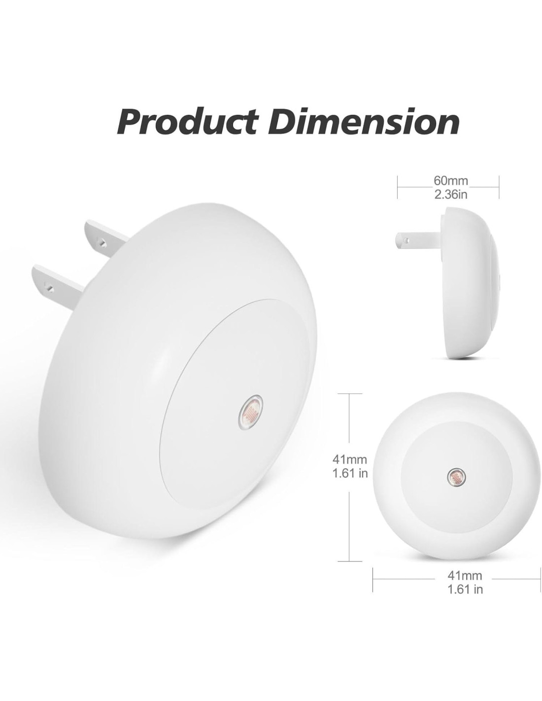 ¿Son estas luces nocturnas sensibles al movimiento? No, sensor de luz automático encendido/apagado, se enciende al anochecer y se apaga al amanecer. ¿Tiene un interruptor manual de encendido/apagado? No, es solo un sensor automático. ¿Qué tan grandes son las luces nocturnas? 6.1 cm h x 6.1 cm w x 4.1 cm d (enchufadas), proporcionan una gran luz para un dispositivo tan pequeño. ¿Se pueden colocar dos de estas juntas en un enchufe de pared normal lado a lado? No recomendamos hacer esto. Los sensores de luz no funcionarán correctamente debido a que no hay suficiente espacio entre las luces nocturnas.