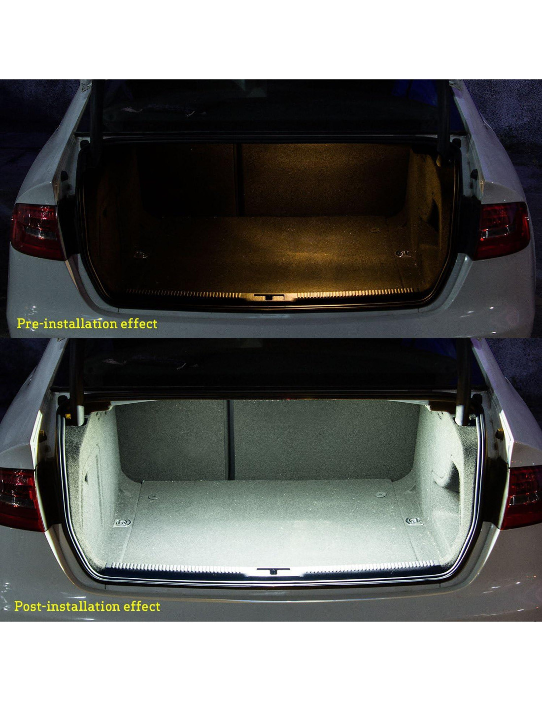 Esta página presenta 1 pieza de tira LED SMD 5050 super brillante de 30 que se utiliza para reemplazar la lámpara central del maletero o área de carga para iluminar toda el área del maletero. Solo se recomienda reemplazar la lámpara del maletero/área de carga ubicada en el medio del maletero para un efecto máximo de salida de luz. Ajuste: Hay un adaptador T10 y un adaptador festón de tamaño ajustable en este paquete que se ajustará a cualquier alojamiento de cuña y festón, incluyendo: 168/194/2825 alojamientos de cuña. Ajuste universal para coches.