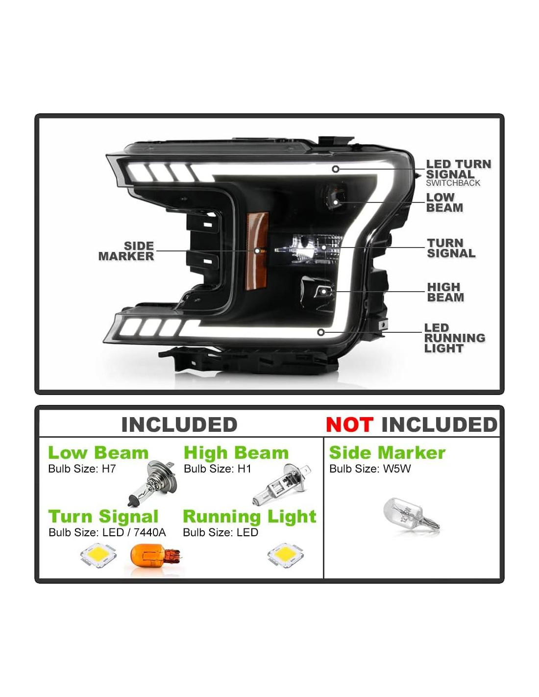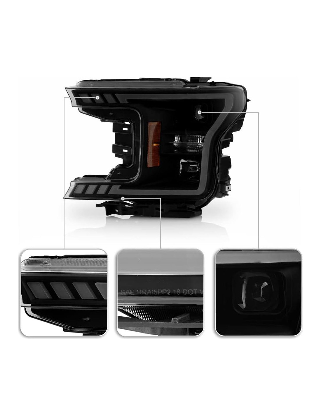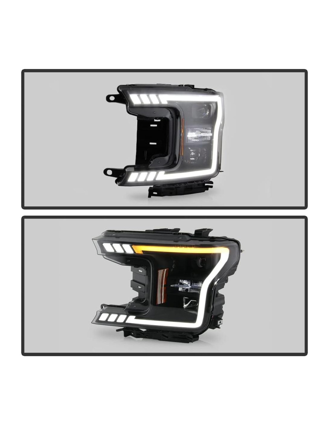 REEMPLAZO DISEÑADO PARA 2018-2020 Ford F150 Camioneta con Modelo de Faro Halógeno [Cabina Regular de 2 Puertas | Cabina Extendida de 4 Puertas | Cabina Crew de 4 Puertas] [Lente Ahumado Obstruye la Salida de Luz | Solo para Uso Fuera de Carretera] Número de Parte Equivalente OEM: KL3Z13008C, FO2502372, FO2503372, KL3Z13008D Atención: [Compatible solo con Modelos de Faro Halógeno de Fábrica] [No Compatible con Modelos de Faro LED de Fábrica] Condición: Nuevo Color: Negro Ónix Carcasa Negra | Lente Ahumado Paquete Incluye: Lado del Conductor y del Pasajero (Carcasa y Lente) CARACTERÍSTICA DEL PRODUCTO Tubo de Plasma: Nuestros "Tuberías de Plasma" ofrecen un Acento de Iluminación Intensa que es compatible con DRL, dando a su Vehículo una Presencia Nocturna Agresiva Protección contra Condensación y Debris: Nuestras Luces Usan el Sellador de Butilo de la Más Alta Calidad para Prevenir cualquier Imperfección que Entre en la Carcasa de la Luz