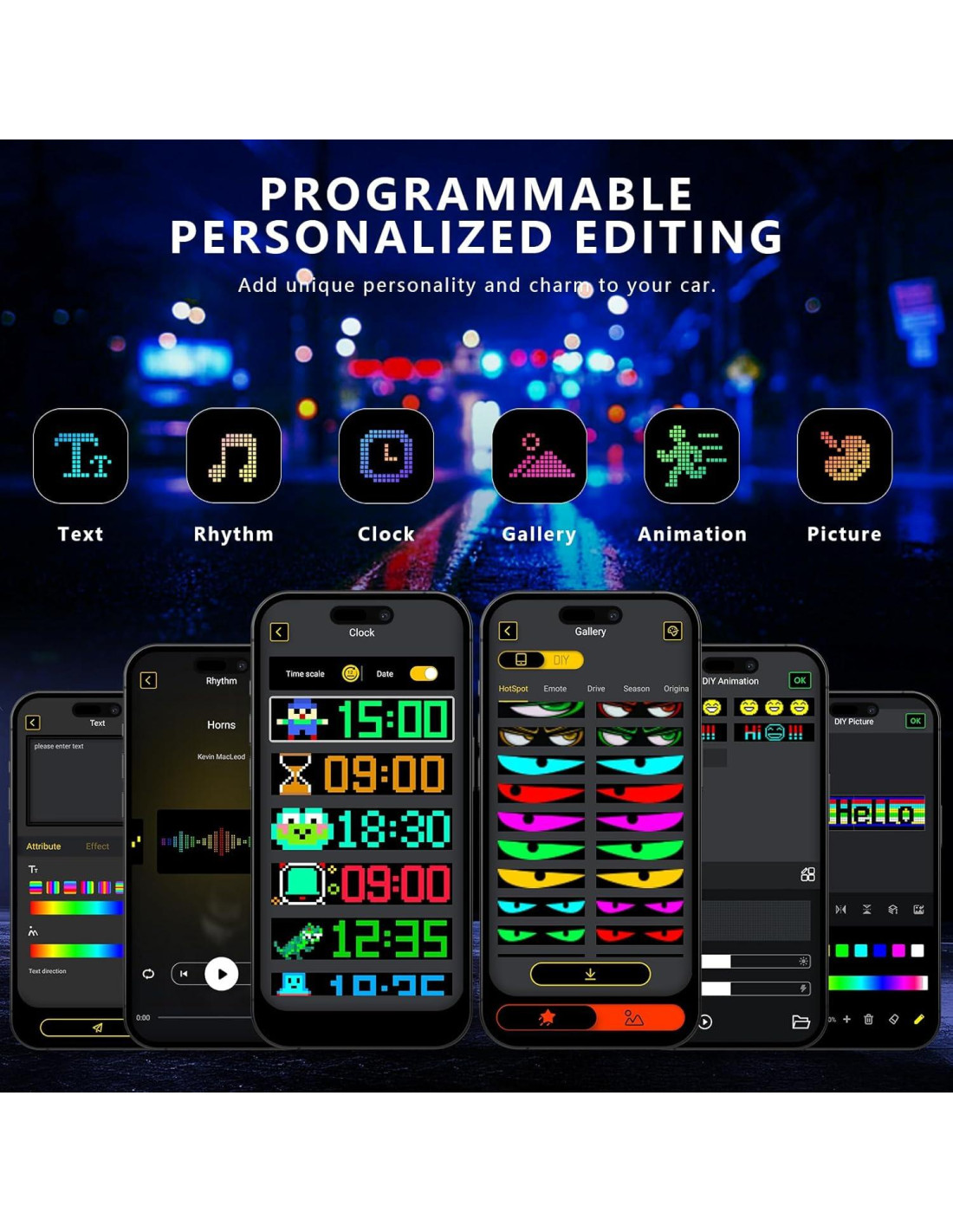 Construido con una rica biblioteca de plantillas de animación preprogramadas para que elijas. Y si eso no es suficiente, también puedes personalizar texto, patrones y efectos dinámicos a través de Bluetooth para satisfacer tus necesidades de exhibición personalizadas, permitiéndote crear un aspecto único que realmente refleje tu estilo.