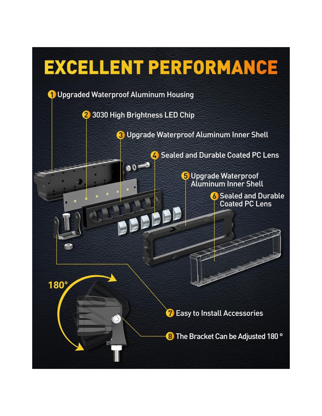 - [Rendimiento Excepcional] - La barra de luz LED adopta una carcasa de aluminio fundido y tecnología de sellado avanzada, el nivel de impermeabilidad alcanza IP68, y tiene un panel de lente de PC resistente, que resiste efectivamente la lluvia, la nieve, las tormentas de arena y otras condiciones adversas. Además, la parte trasera de la luz está diseñada con ventiladores de enfriamiento y una válvula de ventilación para disipar eficientemente el calor. Estas características confirman la longevidad de los pods de luz LED, asegurando un rendimiento confiable incluso en entornos exigentes.