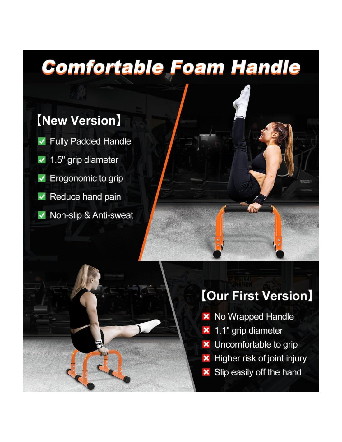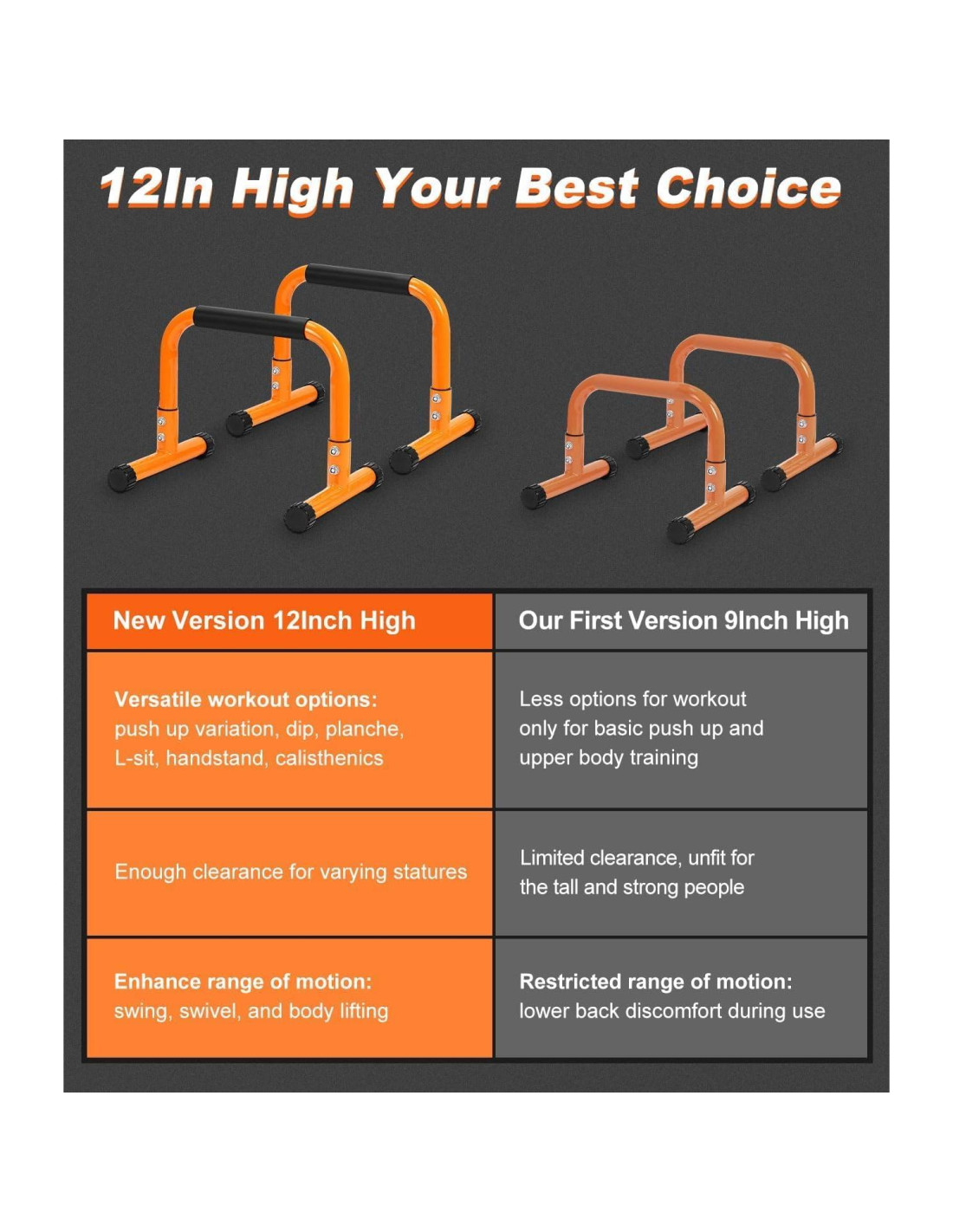 - Altura perfecta de 14 pulgadas (35,56 cm) y uso versátil Las barras paralelas proporcionan una altura ideal de 12 pulgadas (30,48 cm) para principiantes, intermedios o profesionales avanzados en gimnasia, entrenamiento de pesas en lugar de 9 pulgadas (22,86 cm), lo que las convierte en un gran equipo de calistenia para gimnasios en casa. Perfectas para hacer flexiones estándar, flexiones amplias, L-sit, dips, paradas de manos y entrenamiento de fuerza de la parte superior del cuerpo, etc.