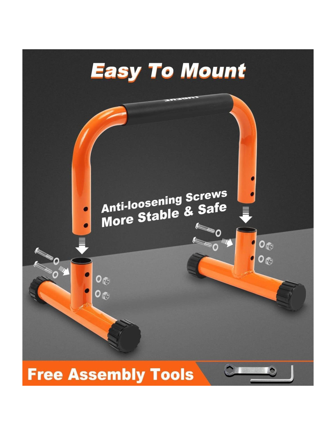 - Capacidad máxima 660 lbs (299,37 kg) Las barras paralelas están hechas de acero de alta resistencia de 1.5MM de grosor, en comparación con otras barras de flexiones de plástico, la capacidad máxima de peso de las paralelas es de hasta 660 libras, más robustas y duraderas. La longitud de la base extendida mejora la estabilidad de la barra de flexiones y evita que se vuelque durante el entrenamiento. La capa exterior de pintura horneada de alta calidad, apariencia hermosa, anti-desprendimiento, a prueba de óxido y fácil de limpiar.