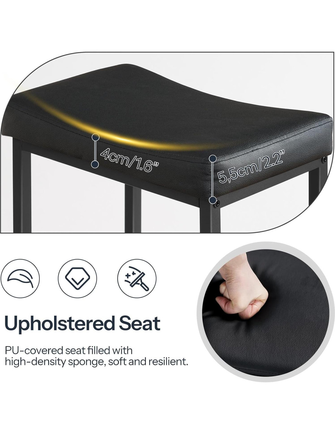 - Forma Moderna: Cada taburete de bar adopta un estilo moderno y su asiento curvado está decorado con cuero PU de calidad. El suave cojín negro y los tubos cuadrados se complementan entre sí, creando una lujosa apariencia discreta