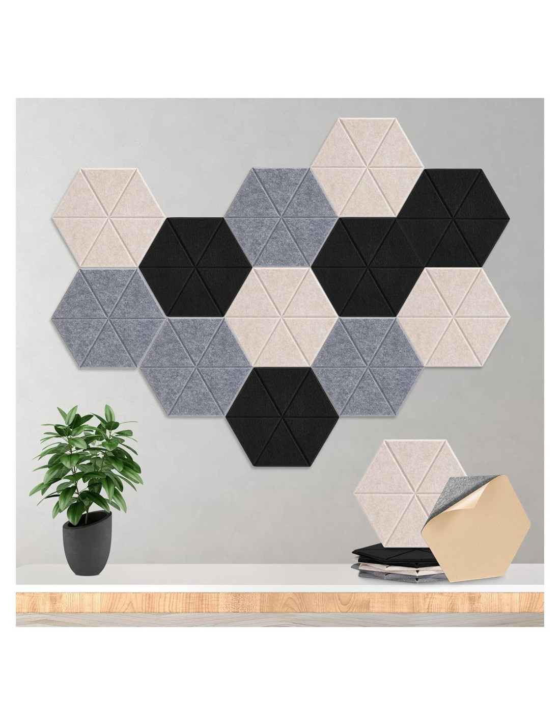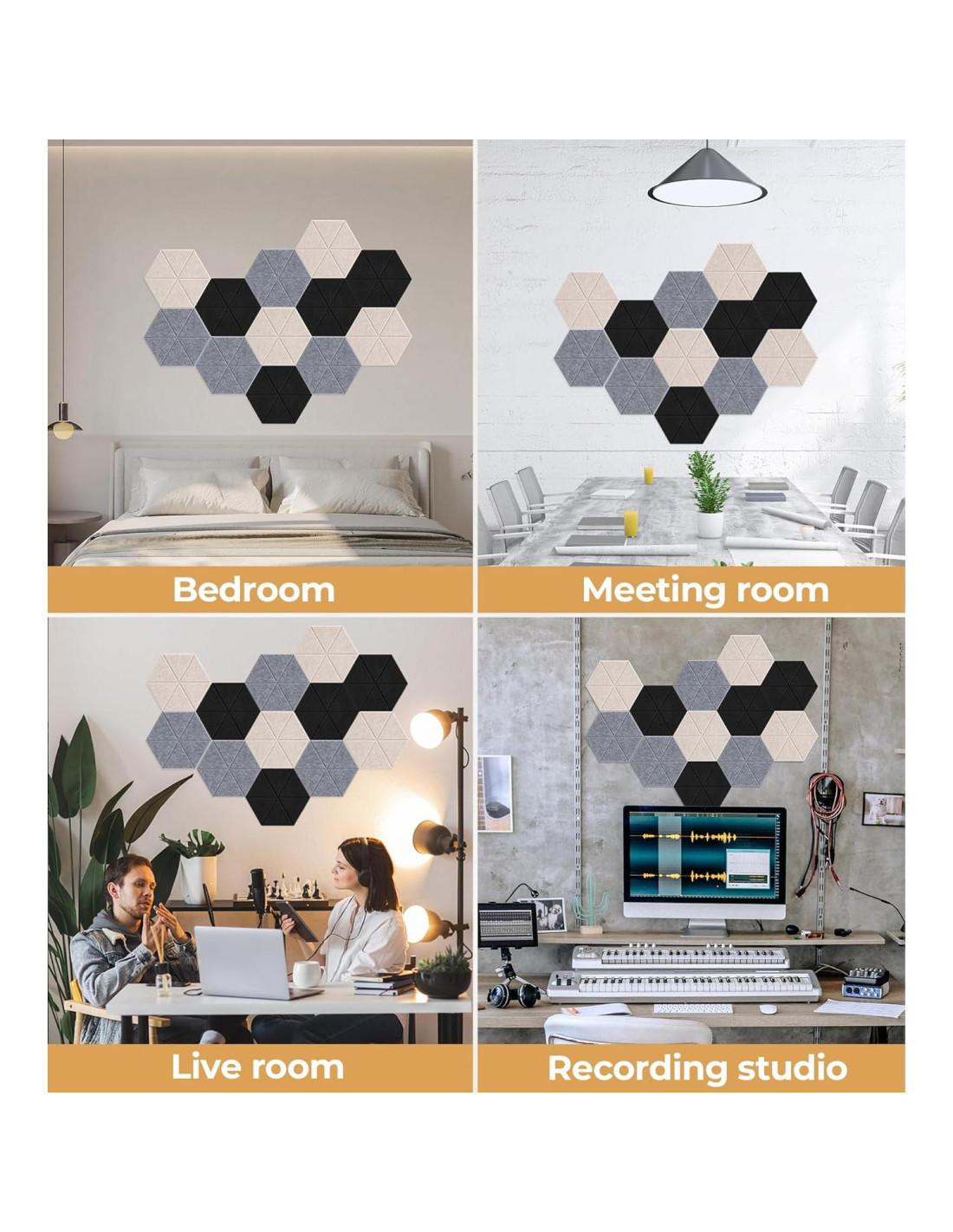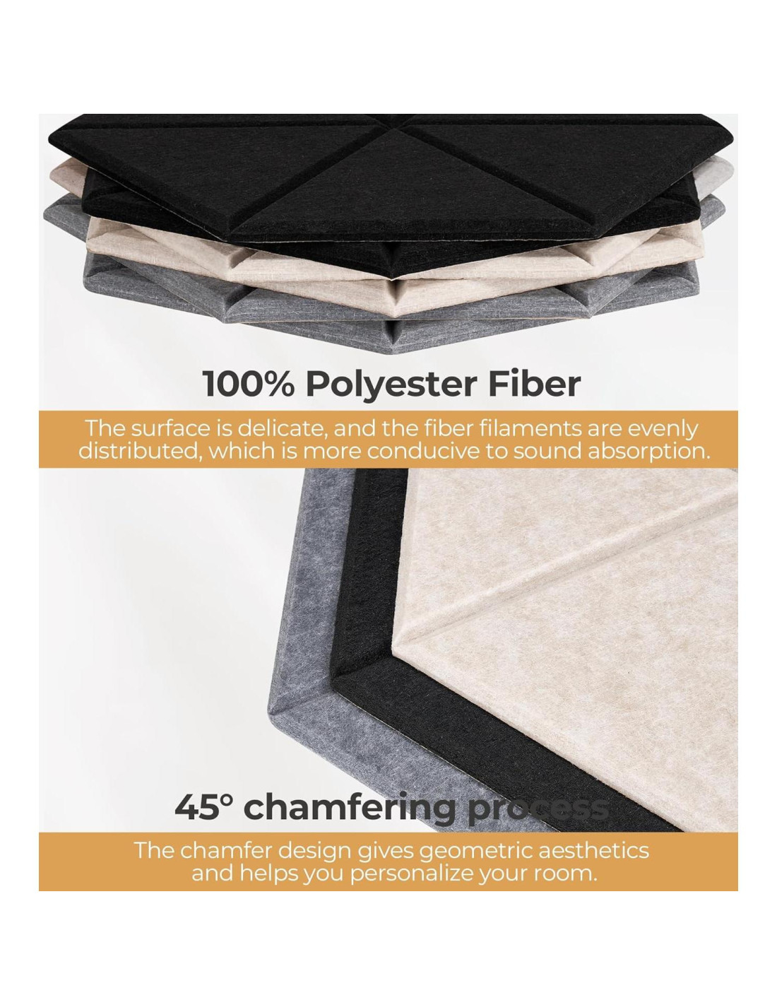 Hemos estado comprometidos con la investigación en los campos de la música y la acústica, y hacer que cada cliente esté satisfecho es nuestra misión. Este panel a prueba de sonido te ayudará. El coeficiente de reducción de ruido de nuestros paneles absorbentes de sonido de fibra de poliéster es aproximadamente 0.92, lo que lo convierte en un absorbente de sonido de alta eficiencia con un amplio rango de frecuencias. Además de su propio rendimiento acústico, durante la decoración de paredes, puede reducir efectivamente el área de paredes lisas. Las superficies rugosas harán que las ondas sonoras se refracten múltiples veces, debilitando el volumen del ruido. Acústicamente, te ayuda a reducir el ruido y mejorar la calidad del sonido del espacio. En términos de decoración, puede ayudarte a proteger la pared y hacer que la pared sea más hermosa y personalizada. El diseño hexagonal brinda una atmósfera animada y elegante. Una amplia gama de aplicaciones, ideal para estudio de grabación, sala de transmisión en vivo, apartamentos, cines en casa o salas de reuniones... Por favor, limpia y seca la pared antes de pegar los paneles a prueba de sonido. Si tienes alguna otra pregunta sobre nuestros paneles absorbentes de sonido, no dudes en preguntar a nuestro soporte. Te responderemos dentro de 24 horas.