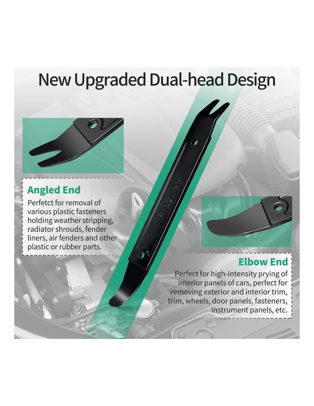 - Uno es suficiente: Nuestra barra de palanca es perfecta para la palanca de alta intensidad de los paneles interiores de los autos, perfecta para quitar molduras exteriores e interiores, molduras, ruedas, paneles de puertas, sujetadores, paneles de instrumentos, etc. También permite la rápida y fácil extracción de varios sujetadores de plástico que sostienen el sellado de clima, cubiertas de radiador, revestimientos de guardabarros, defensas de aire y otras partes de plástico o goma
