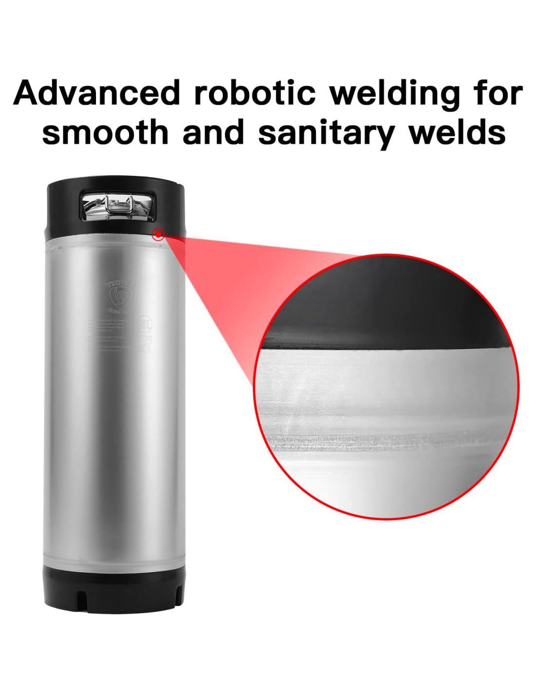 Estos barriles nuevos de marca premium (todo es nuevo, nuevo olor, nuevo brillo, nuevos postes y tubos de inmersión) están clasificados para una presión de trabajo de 130 psi y están hechos utilizando una máquina de soldadura orbital robótica. El acabado de estos barriles es muy superior al de nuestros otros barriles de acero inoxidable económicos y están hechos con soldaduras súper suaves, lo que los hace sanitarios y más fáciles de limpiar. El caucho negro en estos barriles también los hace un poco más agradables de usar en su hogar, ya que son menos propensos a dañar sus pisos de cerámica o agrietar el revestimiento de plástico dentro de su kegerator.