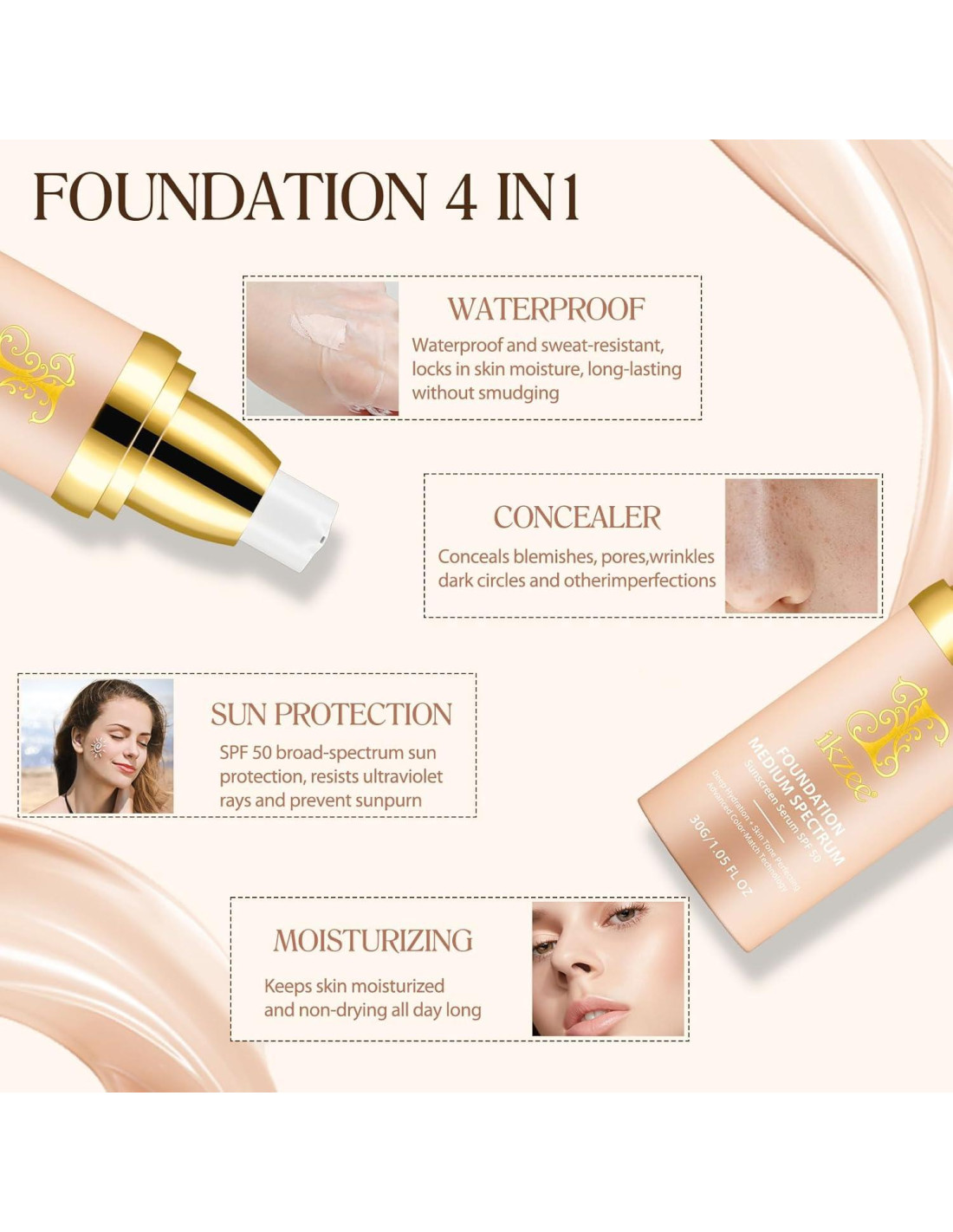 - 4 en 1 BASE DE MAQUILLAJE: base líquida 4 en 1. una combinación de funciones de resistencia al agua, corrector, protección solar, hidratación y otras. ¡Tecnología Avanzada de Igualación de Color! Esta base hidratante y resistente al agua ajusta instantáneamente el tono para coincidir con tu tono de piel y asegura un cutis más uniforme y radiante. Acabado sedoso con tonos naturales y perfectos.