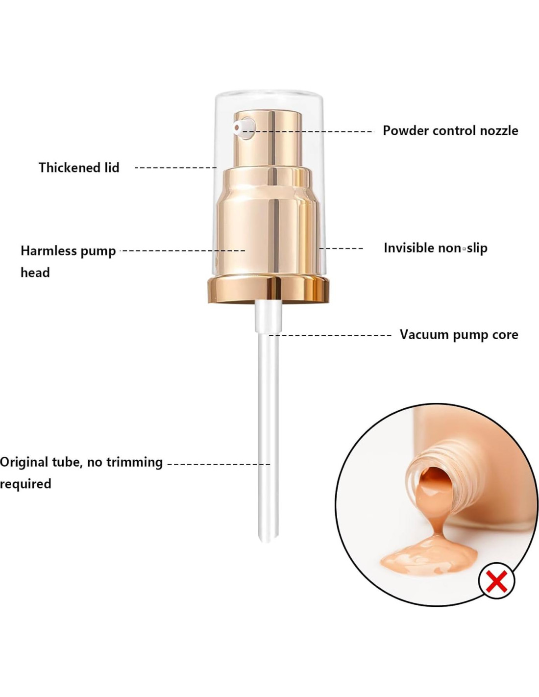 - Dispensación Precisa de Base: Dispensar la cantidad ideal de base con cada bomba, minimizando el desperdicio y el desorden mientras mantiene tu botella ordenada y limpia (Usar tu pulgar para presionar la bomba proporciona un mejor control en comparación con usar tu dedo índice. Para configurarla, retira la tapa de la bomba, atornílala de forma segura a la botella y presiona la bomba varias veces hasta que la base se dispense durante el primer uso. Una vez lista, simplemente presiona la bomba para dispensar la cantidad deseada de base con facilidad.)