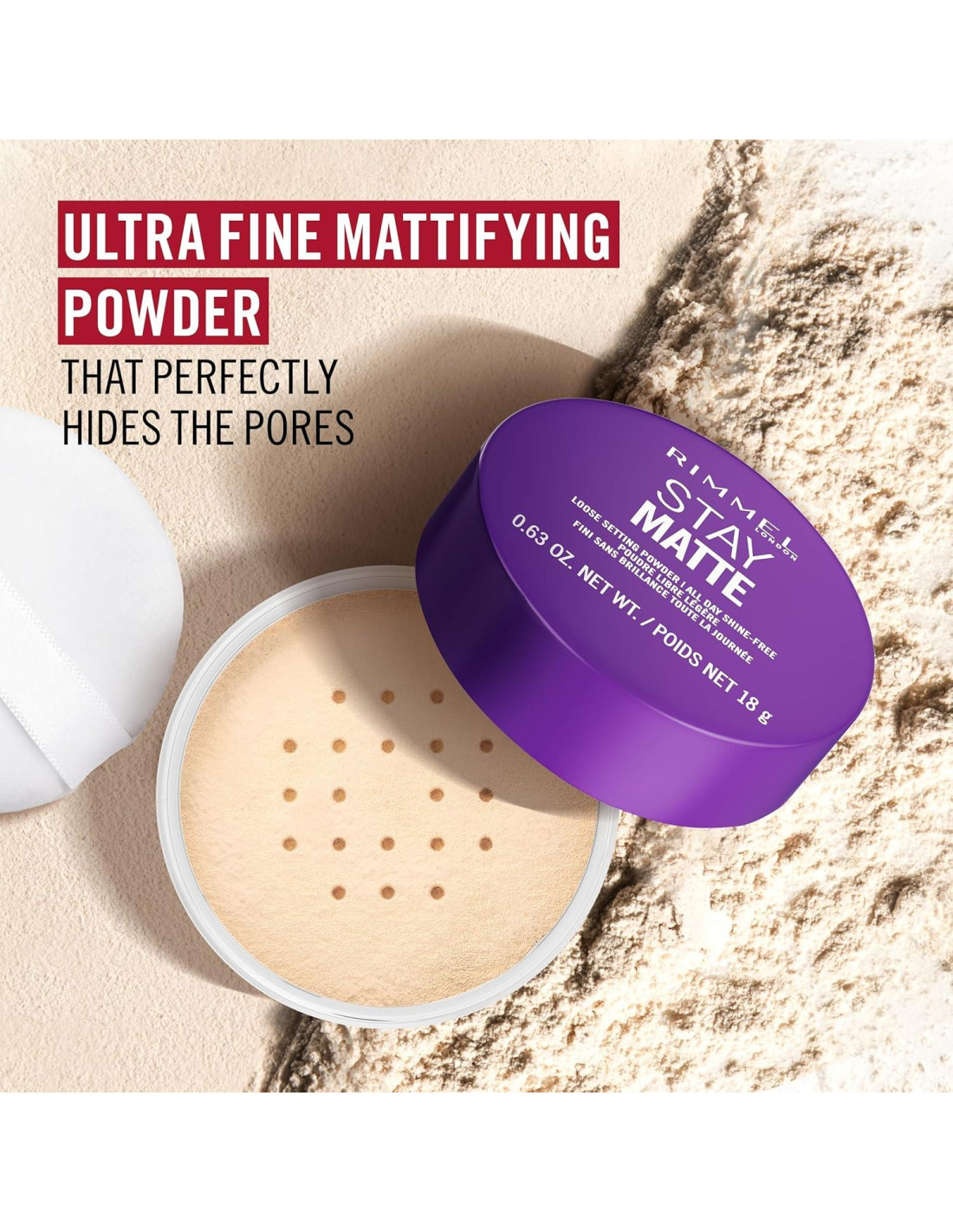Rimmel Stay Matte Polvo Suelto. Acabado mate y sin brillo todo el día para todos los tonos de piel. Ahora nuevo y mejorado. Fija tu maquillaje para un aspecto fresco y natural que dura todo el día. Un polvo de fijación suelto ligero y transpirable con efecto de enfoque suave. Minimiza la apariencia de los poros y no se pliega ni se agrieta.