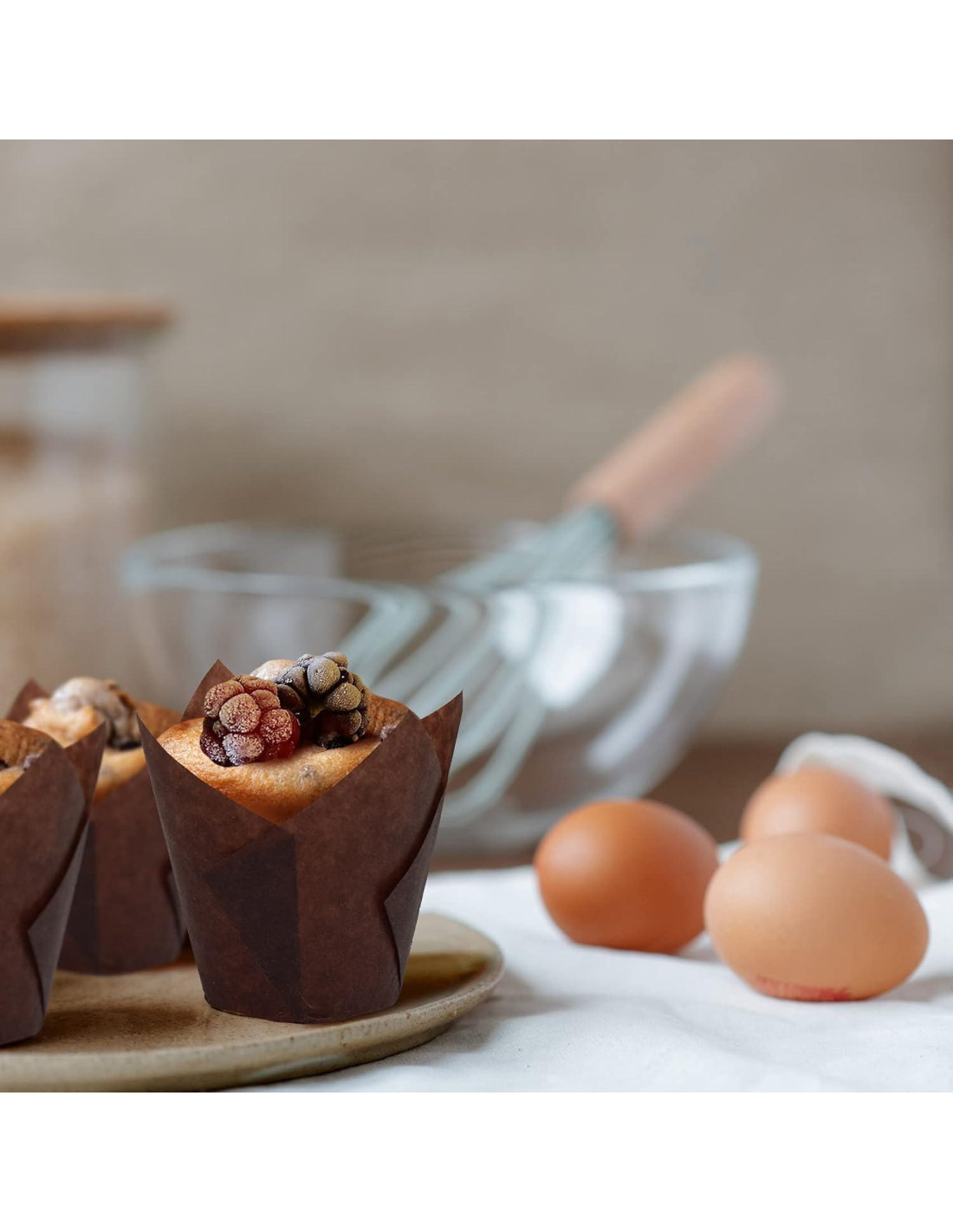- APARIENCIA ÚNICA Y ELEGANTE: Las paredes de cada taza de hornear varían en altura, formando una forma de flor de tulipán. Su color marrón y diseño único crean una presentación de producto elegante, perfecta para mantener la frescura de sus cupcakes, muffins o cheesecakes sin sacrificar su apariencia juguetona;