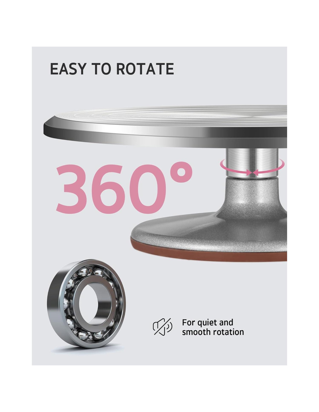 - Rotación Ultra Suave y Silenciosa: Usando rodamientos de bolas de acero inoxidable mejorados y actualizados, el soporte para decorar pasteles Syntus puede girar a 360 sin hacer ningún ruido áspero, permitiendo un fácil acceso a todos los lados y ángulos difíciles de alcanzar del pastel, ahorrando tiempo y aumentando la precisión del proceso de glaseado.