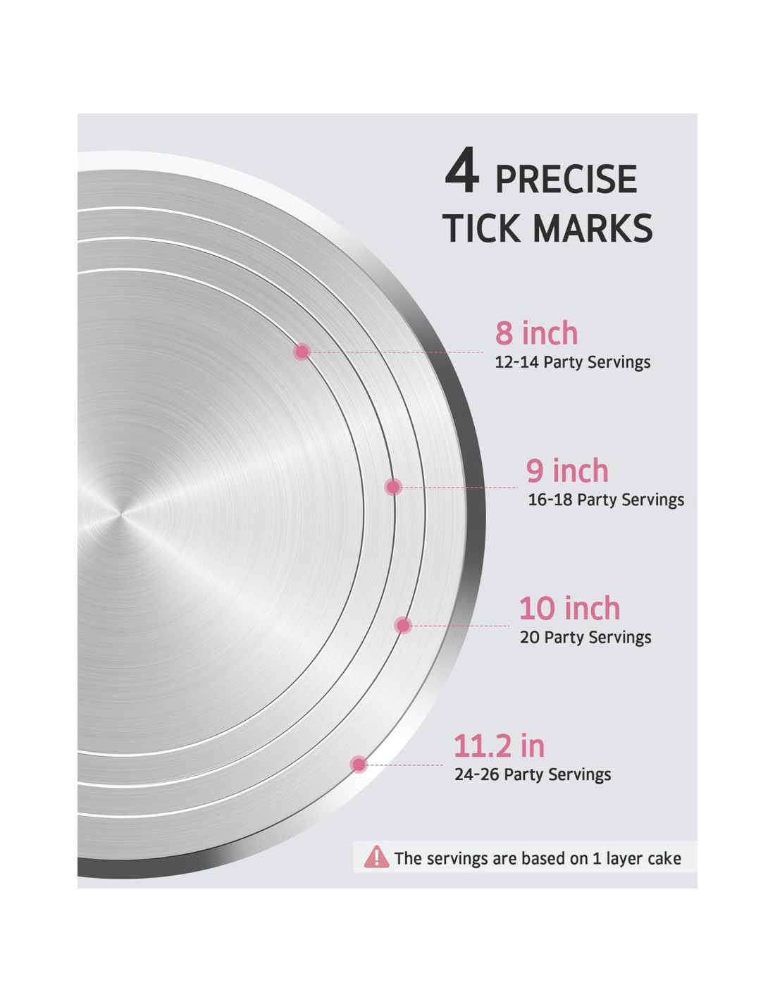 - Plato Giratorio Bien Hecho: El plato giratorio de pasteles Syntus está hecho de aluminio duradero y pesa 4.3 lbs (1,95 kg), lo que lo hace lo suficientemente fuerte para sostener incluso un pastel pesado o grande sin volcarse. Círculos concéntricos grabados en la parte superior que miden 8"/9"/10"/11.2", facilitan la clarificación del tamaño del pastel y centran lo que estás decorando.