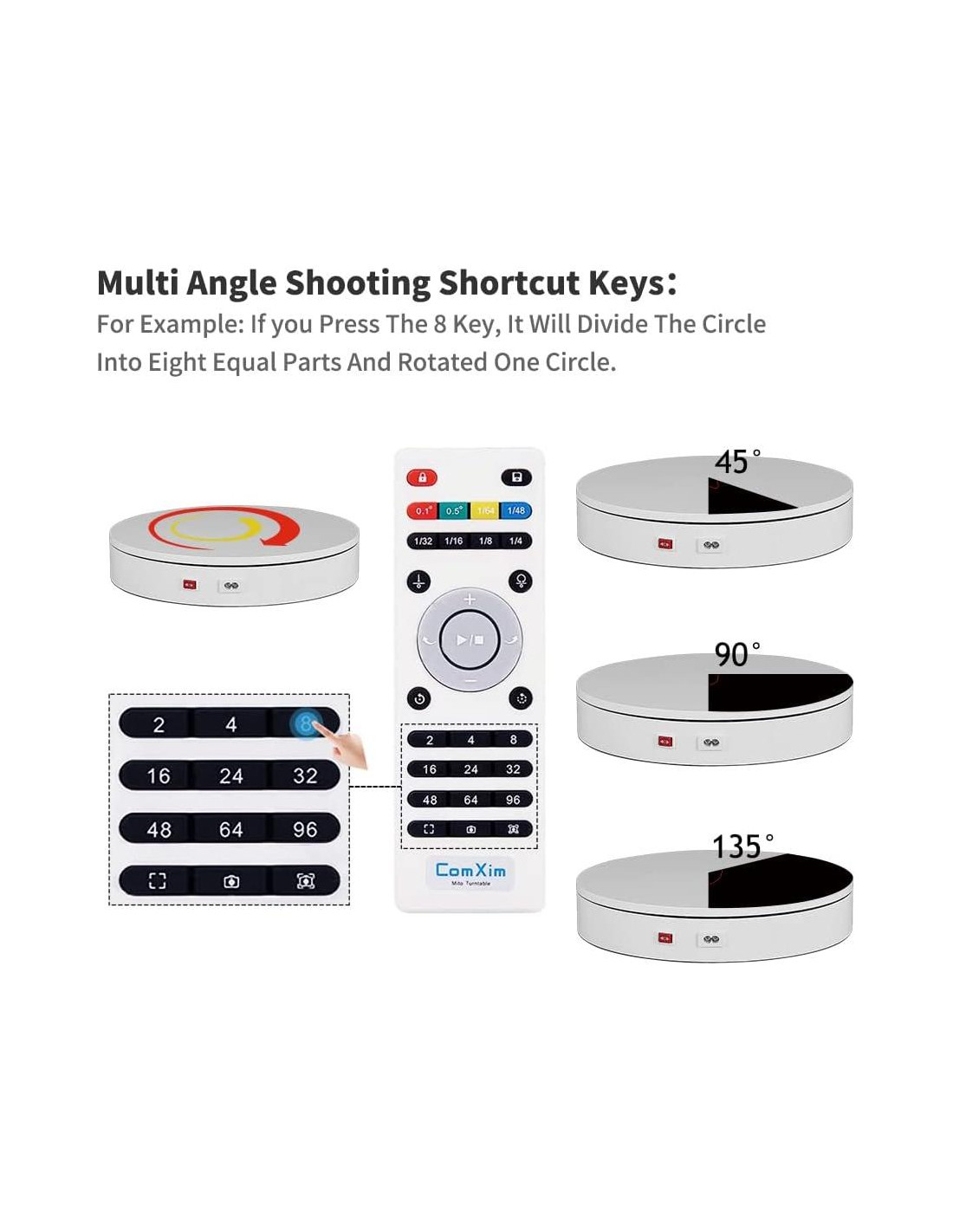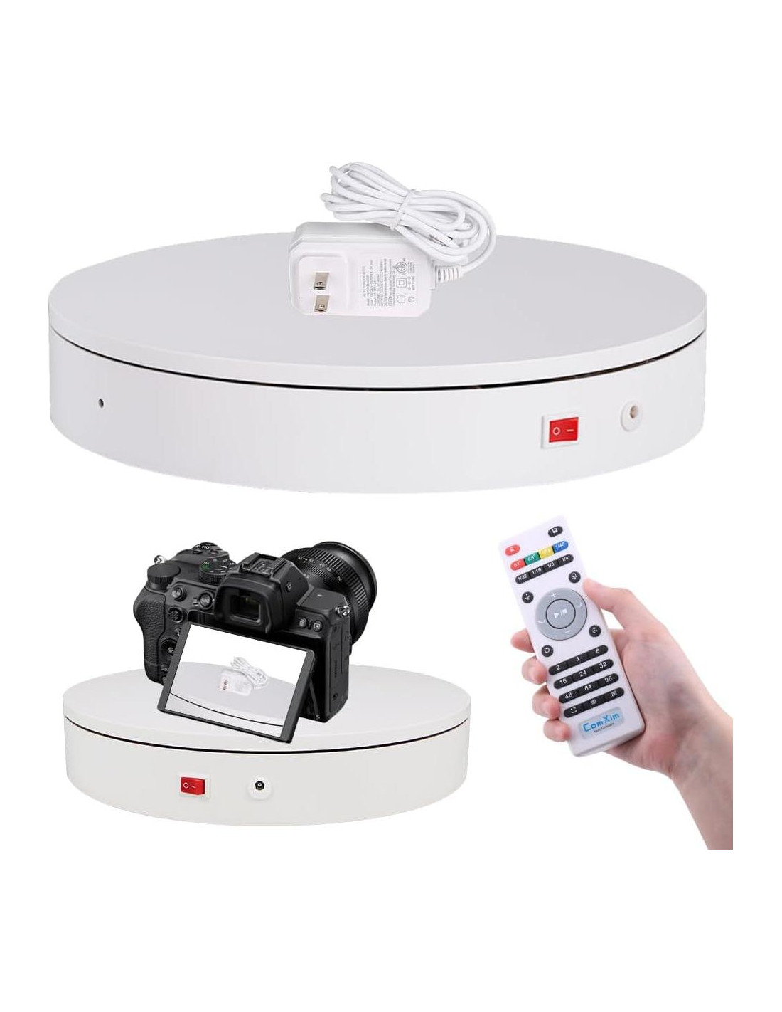 - ComXim plataforma rotativa profesional de 360 grados, que se puede utilizar para exhibición de productos, arte de pintura, fotografía de productos y escaneo 3D. El paquete incluye plato giratorio, fuente de alimentación, control remoto (baterías no incluidas). Este plato de fotografía presenta un diseño de caja de reducción de engranajes híbrida de metal-nylon, que reduce aún más el ruido operativo. Además, este plato giratorio eléctrico utiliza tecnología de regulación de velocidad de frecuencia variable basada en software, extendiendo su rango de ajuste de velocidad a hasta 25 engranajes.