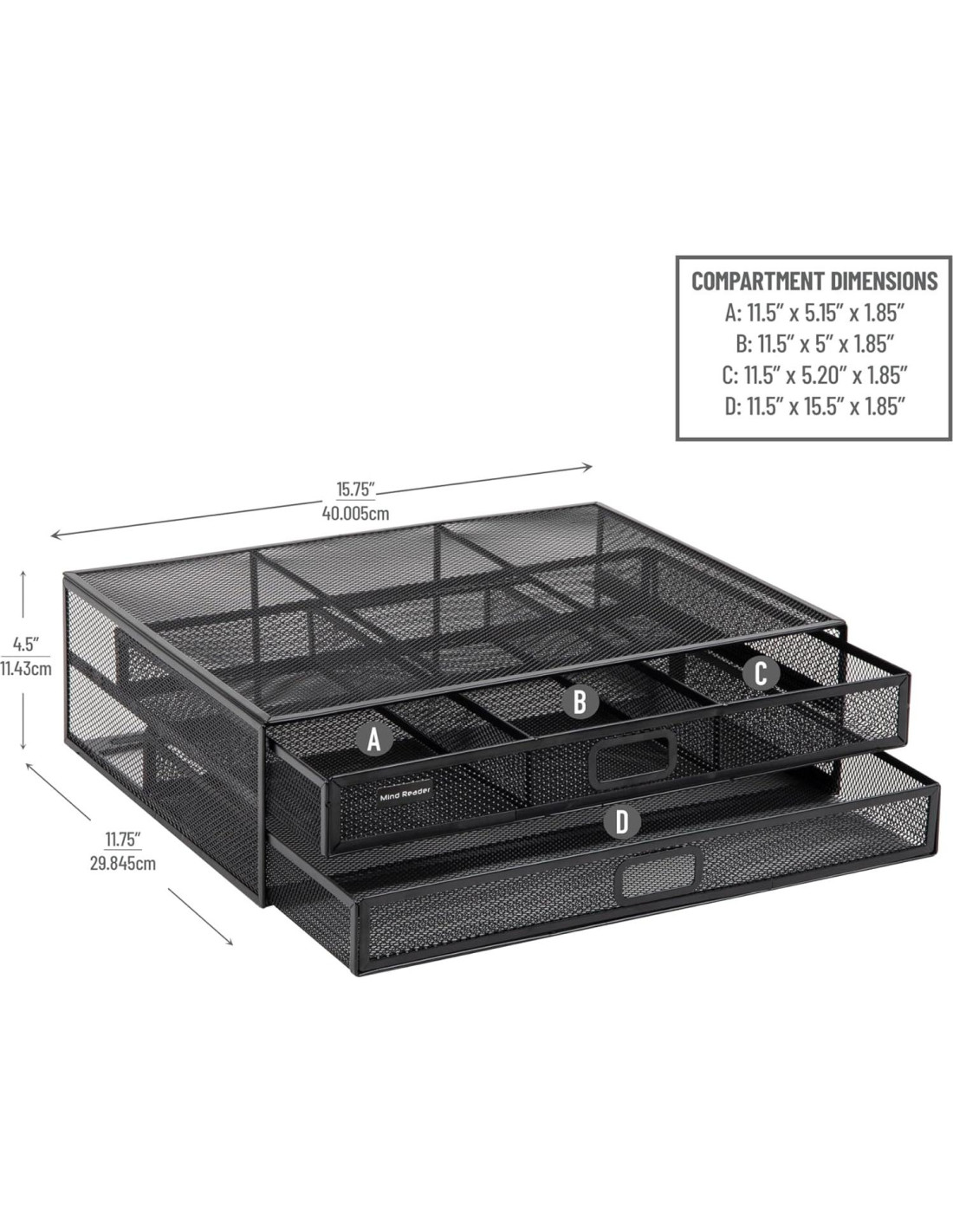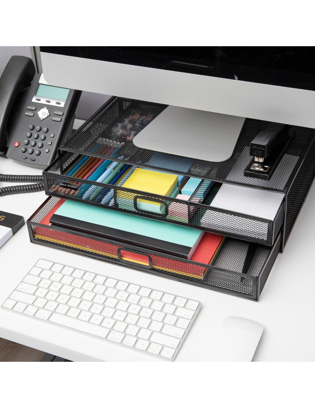 Organizador de Escritorio de Malla de Dos Niveles y Soporte para Monitor Mejora tu espacio de trabajo con nuestro organizador de escritorio de dos niveles y soporte para monitor. Capaz de soportar hasta 18.1 kg, es perfecto para sostener de manera segura dispositivos electrónicos de escritorio como laptops, cuadernos, monitores, impresoras, y también puede funcionar como soporte para TV. La duradera construcción de malla de metal asegura que resista el uso diario. Las agarraderas antideslizantes en la parte inferior del soporte lo mantienen firmemente en su lugar, asegurando que tus artículos permanezcan seguros y estables. Con un peso de solo 2 kg, también es extremadamente portátil y se puede mover fácilmente a donde lo necesites. Maximiza tus capacidades de organización con dos niveles de cajones. El nivel superior es ideal para almacenar archivos, carpetas y otros documentos importantes, mientras que uno de los cajones extraíbles cuenta con tres compartimentos separados para almacenar artículos de oficina como bolígrafos, lápices y clips. El diseño transparente te permite localizar rápidamente lo que necesitas. Este organizador de escritorio es una gran adición a tu configuración de oficina y se integra perfectamente con el resto de la Colección Network. También es un excelente regalo para graduaciones, cumpleaños, festividades y otras ocasiones especiales. Aumenta tu productividad y mantén tu espacio ordenado con este versátil organizador de escritorio.