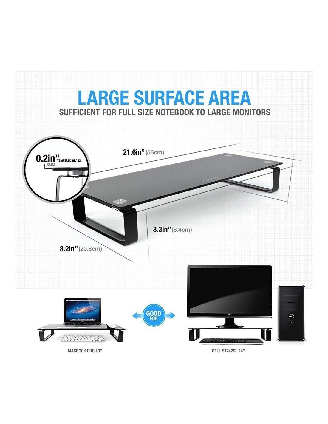 - VIDRIO TEMPLADO: (0.32 cm de grosor) Vidrio templado duradero con patas de metal completo que proporcionan un fuerte soporte para tus necesidades de soporte de monitor.