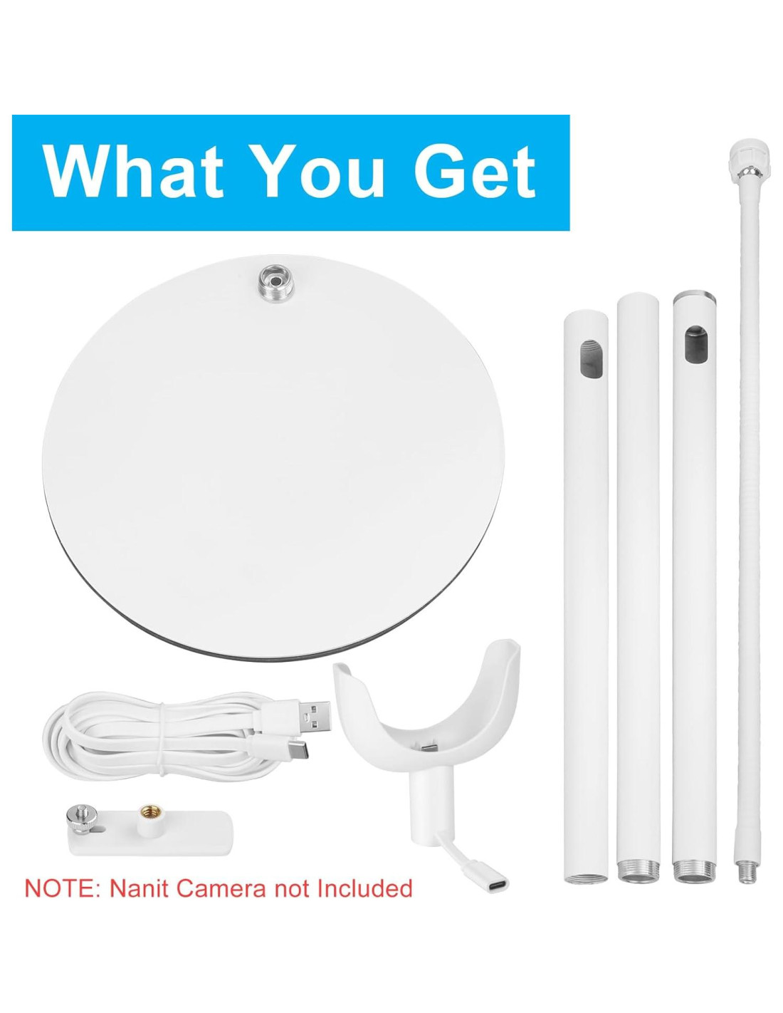 1 * Base Circular, 1 * Cable de Alimentación, 3 * Poste (1 * Brazo de Cuello de Ganso, 1 * Conector de Carga, 1 * Conector de Respaldo. Nuestro soporte diseñado de manera innovadora está específicamente desarrollado para abordar el problema de mala conexión, holgura y separación entre la cámara Nanit y su soporte original. El soporte cuenta con un sensor de temperatura y humedad integrado, así como un puerto de carga Tipo-C, lo que lo convierte en una opción perfecta para la Cámara Nanit Pro. 1. Base Estable y postes ampliados 2. Altura Ajustable de 175cm (68.8 pulgadas) 3. Rotación de 60 Grados 4. Construcción de metal duradera para seguridad. 5. Instalación y remoción convenientes y sin esfuerzo. Soporte de Piso para Monitor de Bebé Soporte para Monitor de Bebé Flex Clip de Monitor Nanit Pro Soporte para Monitor de Bebé