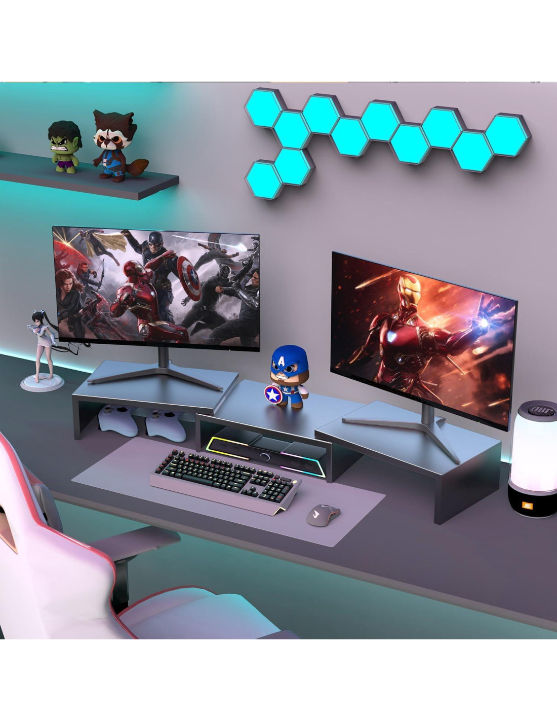 - Expandir Espacio en el Escritorio El soporte para monitor de escritorio aumenta tu espacio de almacenamiento en el escritorio al elevar el monitor, optimizando la eficiencia del almacenamiento. El ancho personalizable te permite ajustar la distancia entre los estantes laterales para controlar el tamaño y la huella del almacenamiento, eliminando preocupaciones sobre el espacio limitado en el escritorio.