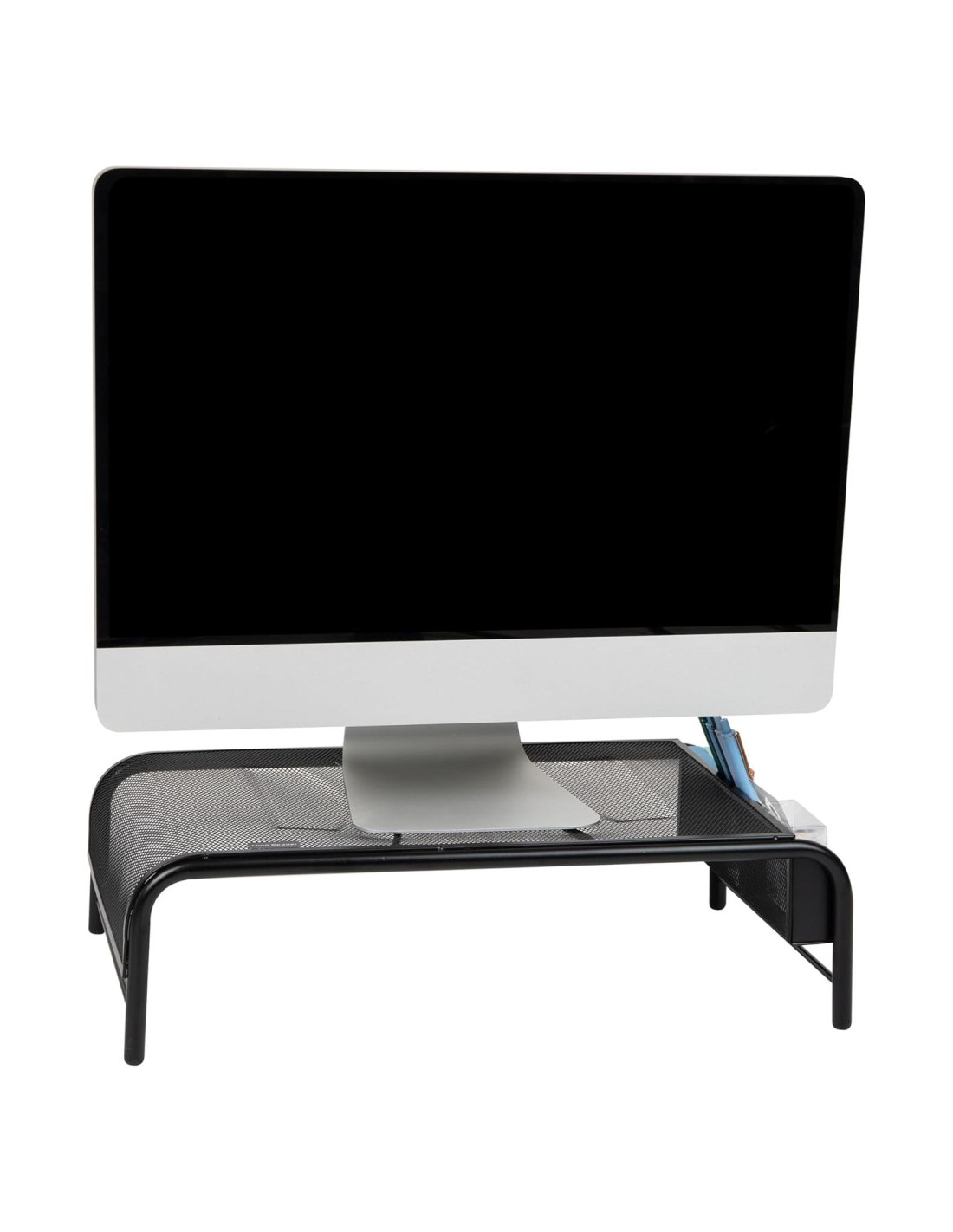 Mejora tu Estación de Trabajo con un Soporte para Monitor Cómodo y Eficiente Maximiza tu eficiencia laboral y reduce la incomodidad con este soporte para monitor ergonómico. Elevar tu monitor o laptop a la altura adecuada te ayuda a mantener una buena postura, reduciendo la tensión y la incomodidad en tu cuello y hombros. La resistente construcción de malla metálica de este soporte para monitor asegura que puede soportar el peso de la mayoría de los monitores y laptops estándar, convirtiéndolo en una adición duradera a tu estación de trabajo. No solo proporciona un ángulo de visión cómodo, sino que también funciona como un organizador de escritorio para ayudarte a maximizar tu espacio de trabajo. Con dos compartimentos de almacenamiento en el lado del soporte, puedes acceder fácilmente a bolígrafos, marcadores y otros suministros de oficina. Incluso puedes guardar tu teclado o archivos debajo del soporte para liberar más espacio en el escritorio para otras tareas. Los soportes recubiertos de goma en la parte inferior del soporte para monitor lo mantienen firmemente en su lugar, mientras que el diseño que ahorra espacio lo convierte en un gran regalo para cualquiera que necesite una estación de trabajo más cómoda y organizada. Para cualquiera que pase mucho tiempo frente a un monitor de computadora, este soporte y organizador para monitor es la manera perfecta de mejorar tu productividad y reducir la incomodidad.