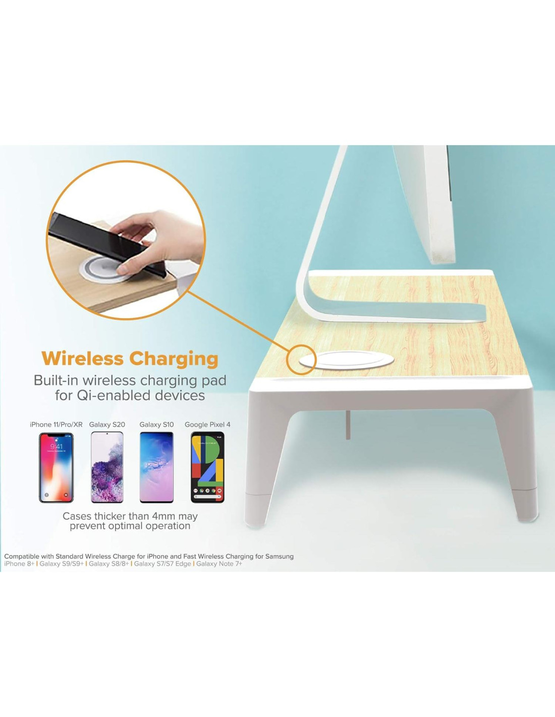 Eleva tu espacio de trabajo al siguiente nivel con el Soporte de Monitor de Madera Bostitch con Base de Carga Inalámbrica. Al elevar tu monitor a un nivel cómodo a la vista en este soporte de grano de madera, ayuda a mejorar el ángulo de visión y la tensión ocular y del cuello. Ideal para una sola laptop o monitor, este elevador de monitor tiene dos opciones de altura que se adapta perfectamente a cualquier escritorio. ¿Buscas cargar tu teléfono o tableta mientras trabajas en tu escritorio? La base de carga inalámbrica integrada puede cargar cualquier dispositivo habilitado para Qi sin problemas mientras trabajas en tu computadora. Este elevador de monitor también funciona como una herramienta de organización ya que incluye un cajón adicional para el almacenamiento de pequeños suministros de oficina. Las almohadillas de goma antideslizantes ofrecen soporte completo y durabilidad para hasta 15 kg (33 lbs) y el soporte para monitor cuenta con un ensamblaje fácil.