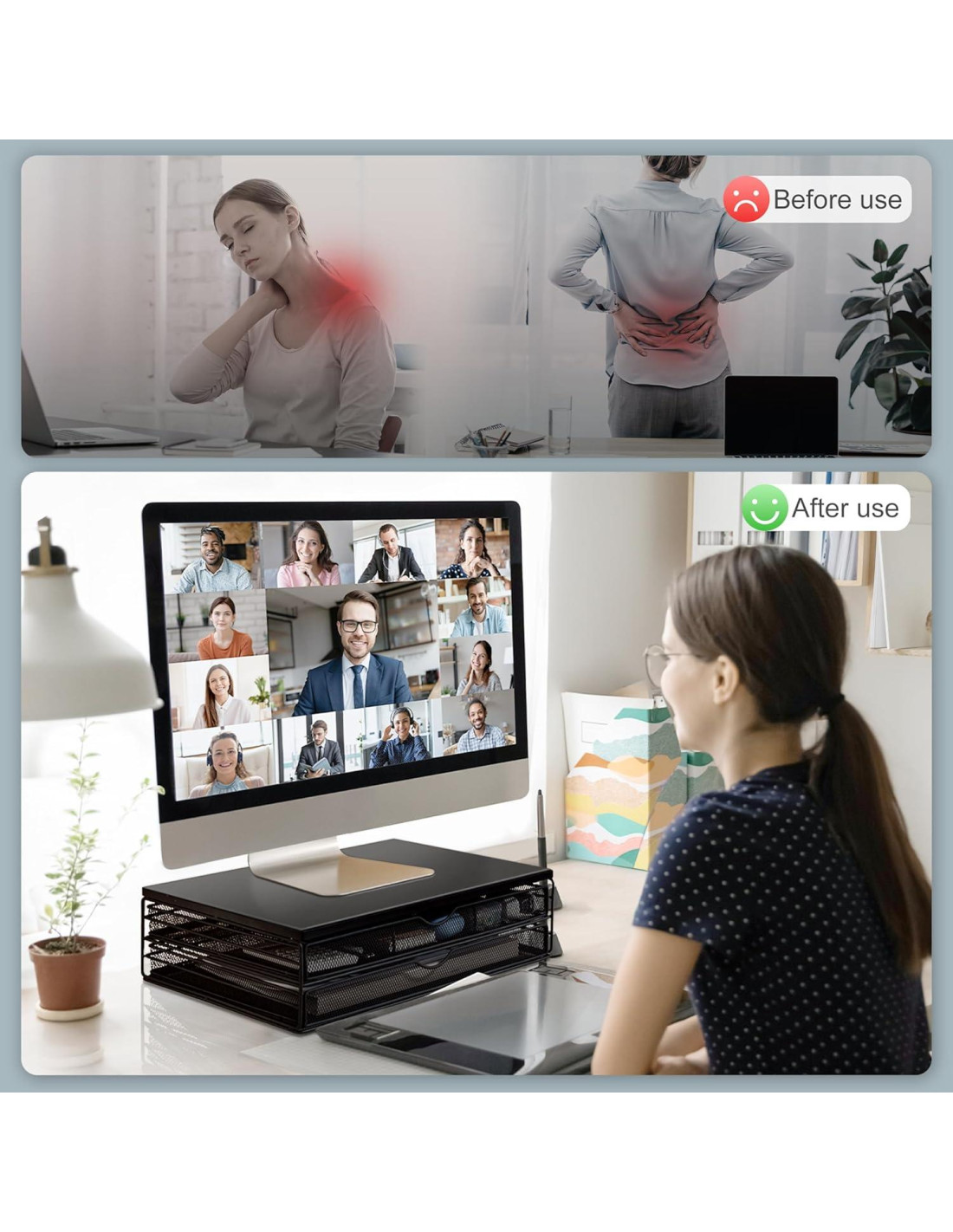 - DISEÑO ERGONÓMICO: Este soporte para monitor de computadora para escritorio eleva tu monitor a la altura de los ojos para una experiencia de visualización cómoda, puede mejorar efectivamente la postura para reducir la fatiga ocular, la rigidez del cuello y el dolor de espalda durante el tiempo de trabajo.