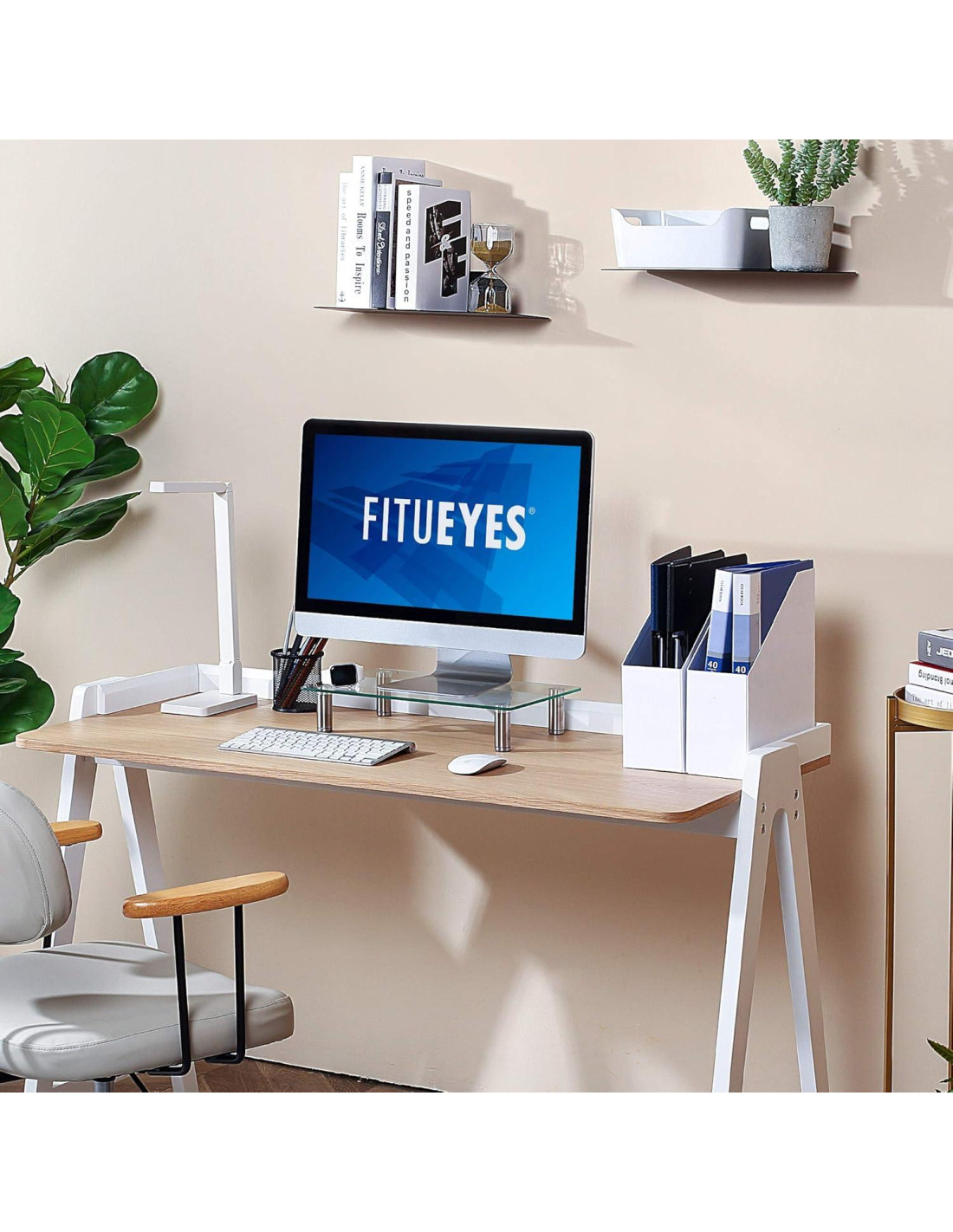 Soporte para monitor FITUEYES, diseñado ergonómicamente para reducir el estrés laboral al colocar científicamente su cuello y ojos en una posición cómoda. El hermoso diseño de alta calidad no solo embellece su área de trabajo, sino que también aumenta el espacio de almacenamiento debajo del mostrador. El material de vidrio hace que el producto sea en general claro y brillante, puede ver claramente lo que se coloca debajo del marco elevador.