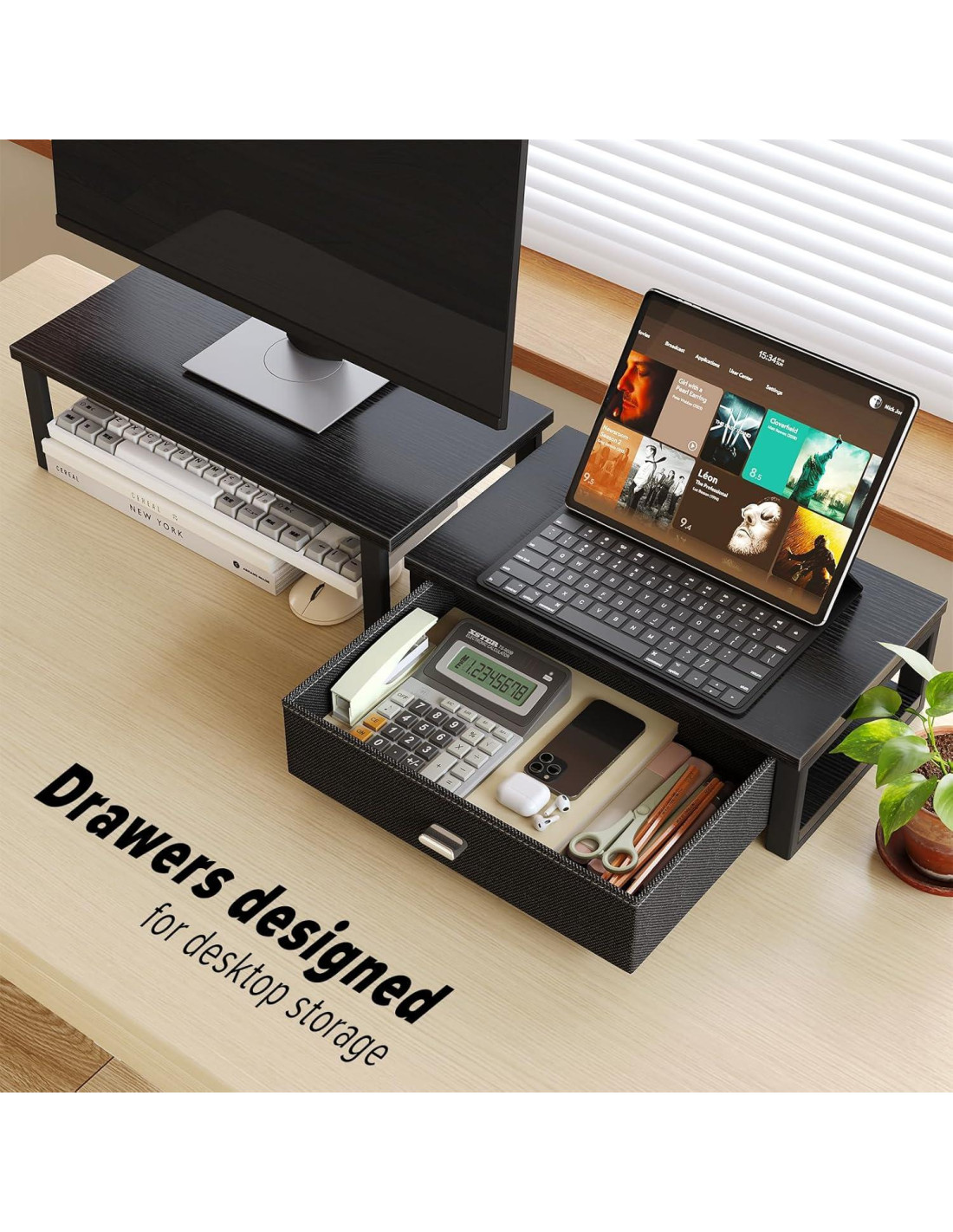 - Soporte para Monitor con Cajón: El pequeño soporte incluye un cajón para organizar bolígrafos, clips y otros artículos pequeños, manteniendo tu escritorio libre de desorden