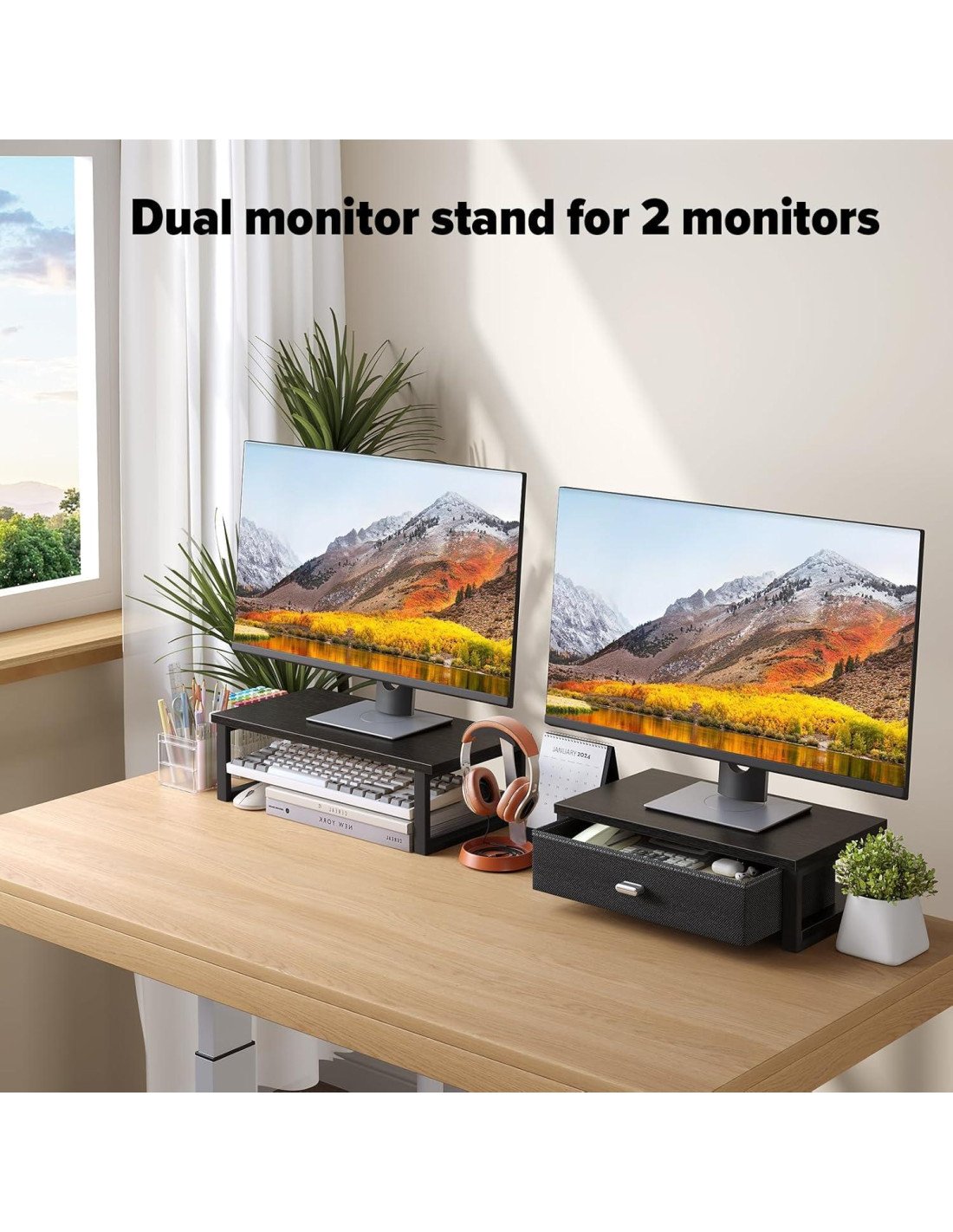 - Soporte Doble para Monitor: Ideal para Estaciones de Trabajo con Múltiples Computadoras. Debajo del soporte proporciona almacenamiento conveniente para tu teclado compacto, grapadora de oficina, organizadores de escritorio y otros elementos esenciales diarios