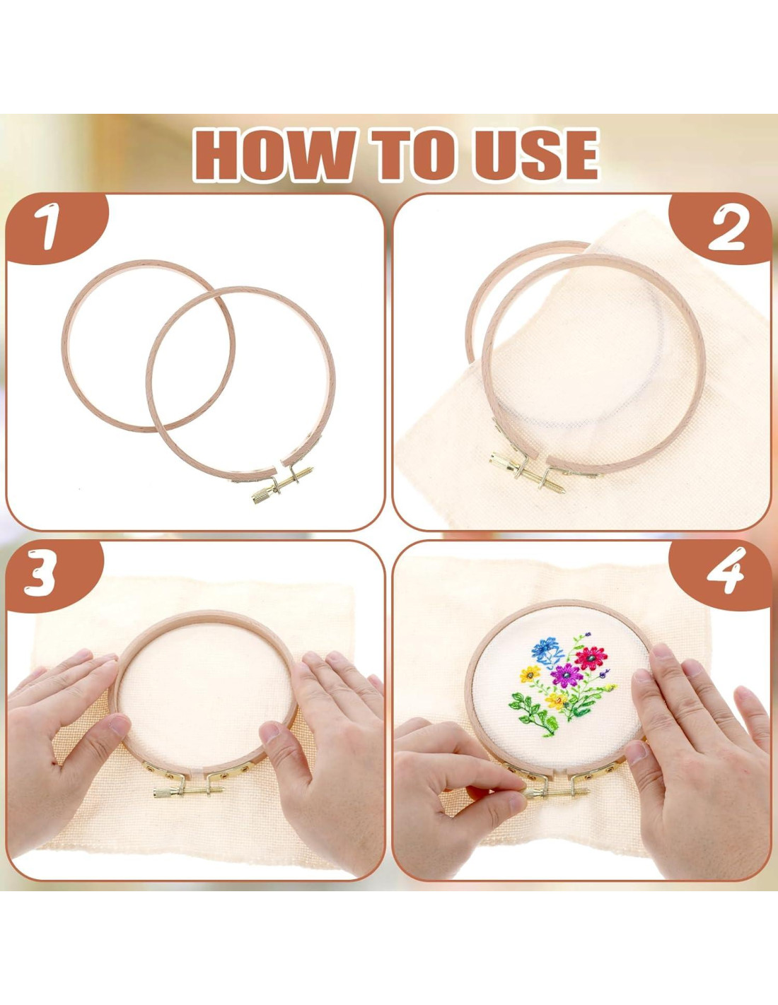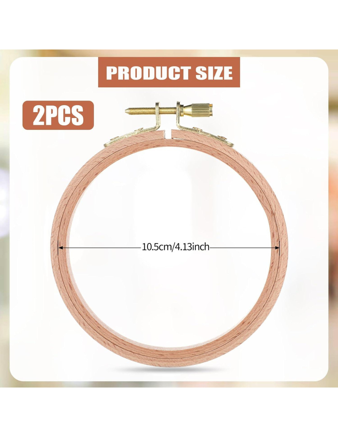 - Contenido del Paquete: El conjunto de aros de punto de cruz incluye 2 pcs Aros de Bordado de Madera de Haya de 4 Pulgadas (10.5cm) con tornillo de latón ajustable