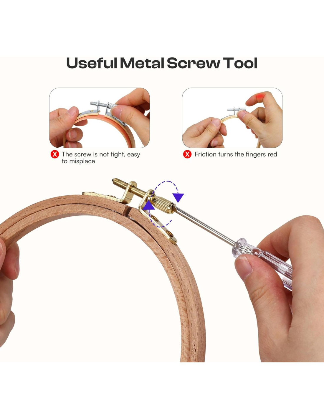 - Fácil de Operar: Simplemente afloja los tornillos con nuestro destornillador, quita el marco exterior, coloca la tela en el marco interior y asegúralo en su lugar. Este proceso simple asegura que la tela se mantenga suave y ajustada en el aro de bordado, lo que lo hace ideal para principiantes que comienzan a bordar