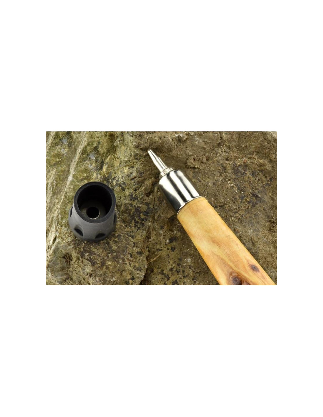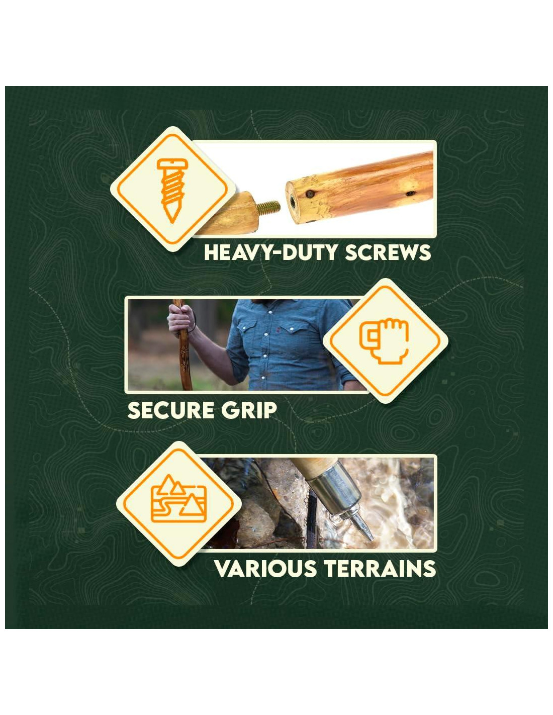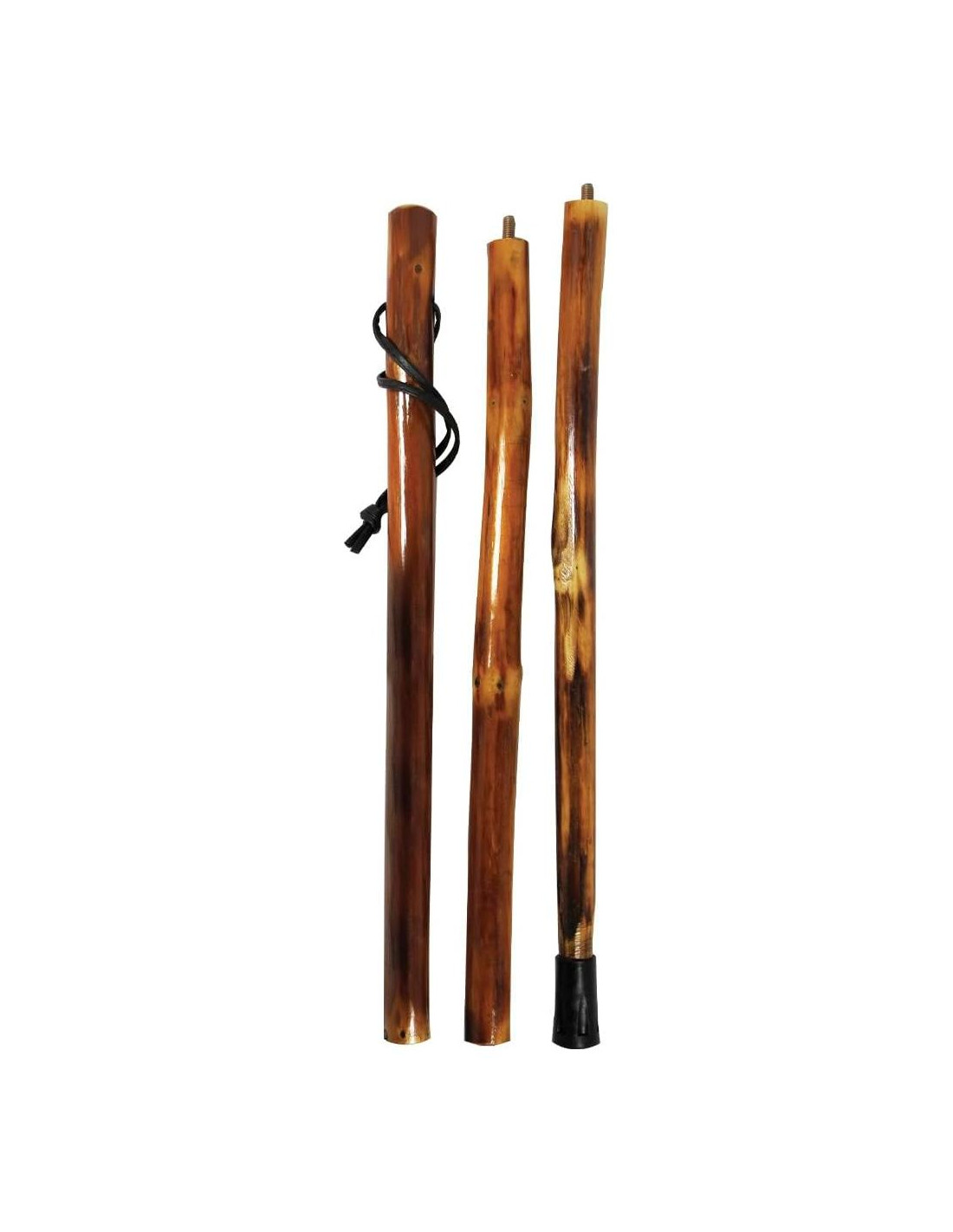 Diseño Desmontable de 3 Piezas: Fácil de llevar y almacenar Hecho de pino duro con un acabado resistente a la intemperie Montura para Cámara: Captura aventuras sin manos (quitar la parte superior para exponer la montura) Mango Envuelto en Cuerda: Agarre seguro para estabilidad Correa de Muñeca de Paracord: Seguridad adicional y uso en emergencias Punta de Metal: Duradera, proporciona tracción Cubierta de Punta de Goma Reforzada con Metal: Mejor agarre en diversas superficies Bolsa con Cierre Incluida: Almacenamiento y portabilidad convenientes