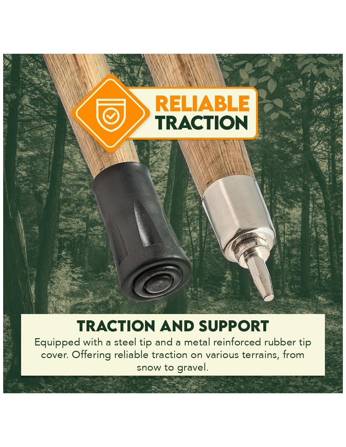- Tracción y Estabilidad Mejoradas: Equipado con una punta de metal y una punta de goma reforzada con metal removible, este bastón de senderismo proporciona tracción y estabilidad superiores en diversos terrenos, incluyendo roca, suelo compactado y hielo