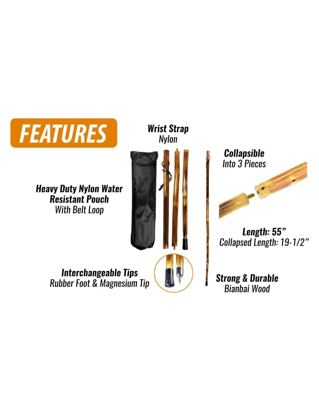 - Diseño Compacto y Portátil: El Bastón de Madera Desmontable de 3 Piezas de 55" se descompone fácilmente en secciones de 19-1/2" (49,53 cm), encajando perfectamente en una bolsa de nylon resistente al agua con un lazo para cinturón, lo que lo hace perfecto para viajar y almacenar