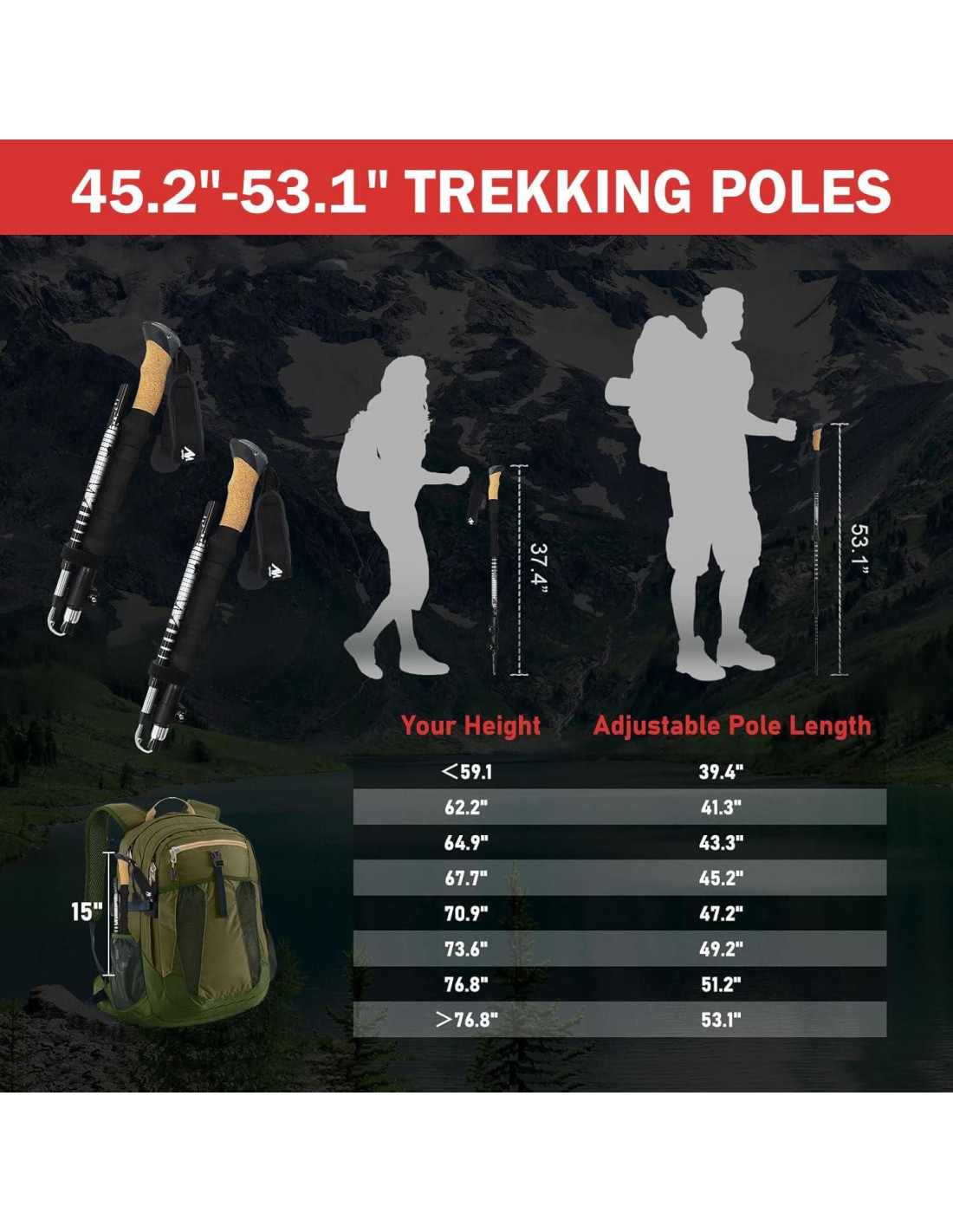 - [Diseño Tri-Fold - Compacto para Llevar] - Gracias a su diseño retráctil en tri-fold. El sistema de plegado de los bastones de senderismo se colapsa a un tamaño portátil de 38.1 cm, que cabe en mochilas, maletas o bolsas de viaje para un transporte compacto. La altura de los bastones tiene un rango de ajuste de 114.8 cm - 135.0 cm. Adecuado para hombres, mujeres y adolescentes. Cada paquete viene en un par con una bolsa de soporte.