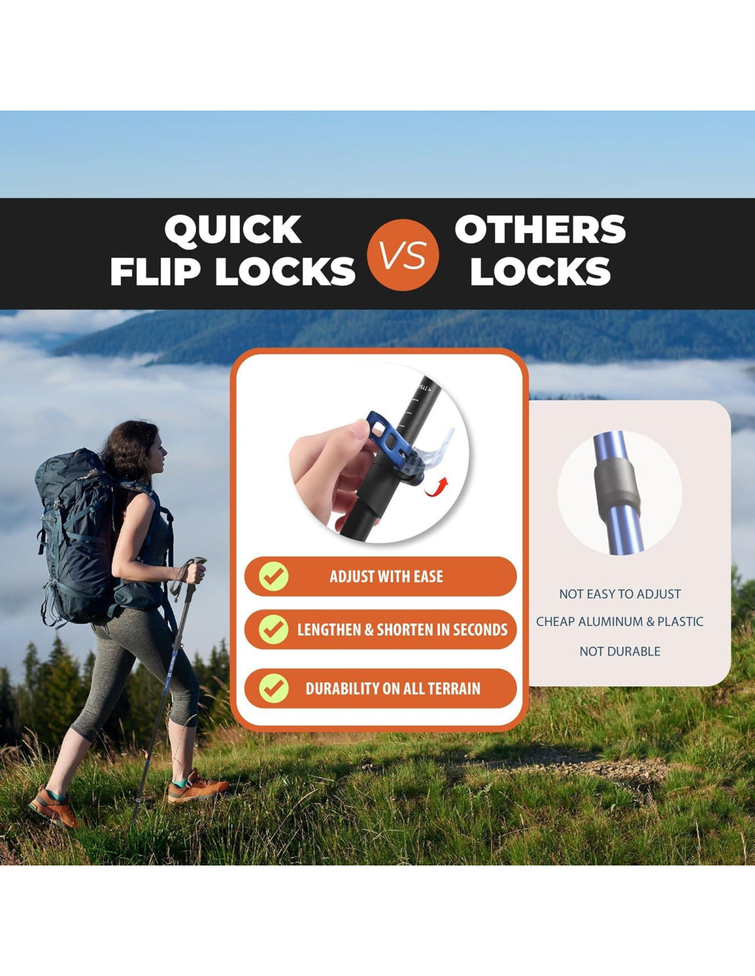 - Construcción Ligera: Cada bastón de senderismo pesa solo 10.2 oz (290 g), lo que los hace ideales para un uso prolongado, ya sea caminando, mochileando, esquiando o cruzando arroyos, gracias al uso de materiales ligeros de alta calidad.