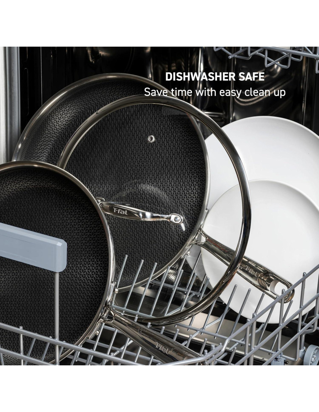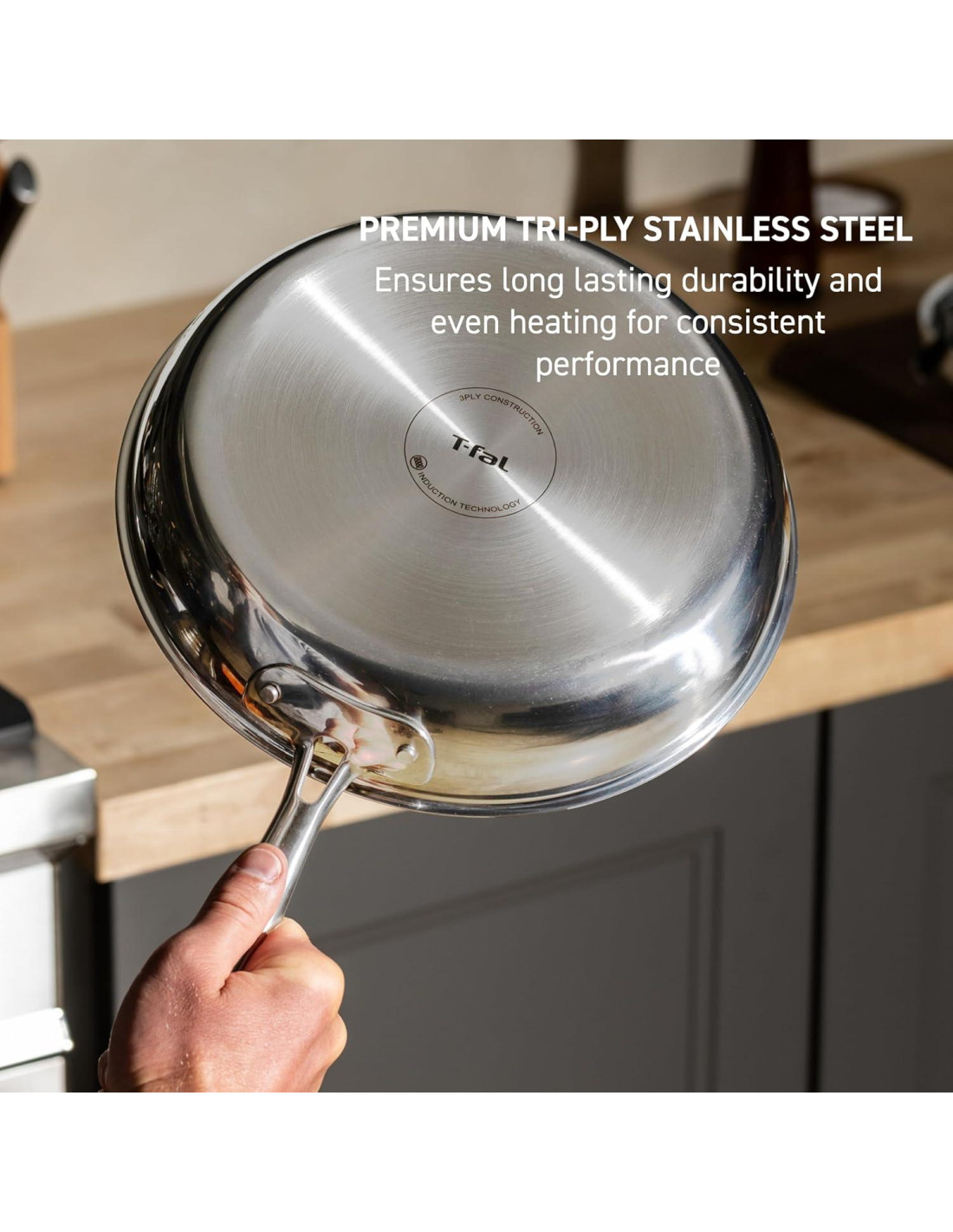 T-fal redefine la cocina con su innovadora Tecnología HybridMesh, combinando sin esfuerzo el poder de sellado del acero inoxidable con la conveniencia y el deslizamiento suave de las superficies antiadherentes. Nuestra avanzada construcción de acero inoxidable de tres capas asegura una durabilidad excepcional y proporciona un rendimiento confiable que soporta la prueba del tiempo. La superficie de cocción se mejora mediante tecnología de grabado de precisión para crear un patrón único y cuenta con el recubrimiento antiadherente Platinum de T-fal, nuestro recubrimiento antiadherente más duradero, 10 veces más resistente en comparación con los recubrimientos básicos de T-fal. Logra la armonía ideal entre patrones de acero inoxidable expuestos para un poder de sellado superior y un recubrimiento antiadherente para un deslizamiento de alimentos sin esfuerzo. Además, la superficie es segura para utensilios de metal, lo que te permite cocinar con confianza y comodidad, sabiendo que tus utensilios pueden manejar altas temperaturas y los utensilios más difíciles. Diseñado con mangos de hierro fundido remachados, nuestras ollas y sartenes proporcionan un agarre seguro y cómodo durante cada sesión de cocina. Disfruta de la máxima conveniencia y versatilidad, ya que este utensilio es apto para horno hasta 500F (260C), lo que te permite preparar una variedad de comidas y pasar fácilmente de la estufa al horno, además, este utensilio es apto para inducción, lo que lo hace compatible con todas las cocinas y permite una distribución rápida y uniforme del calor para prevenir puntos calientes y proporcionar resultados consistentes cada vez. Simplifica la limpieza colocando tus utensilios directamente en el lavavajillas, ahorrando tiempo y esfuerzo valiosos. Este juego de sartenes de 8 pulgadas (20,32 cm), 10.5 pulgadas (26,67 cm) y 12 pulgadas (30,48 cm) proporciona opciones para freír, saltear y sellar. Eleva tu cocina con los utensilios T-fal HybridMesh: la cima del estilo, funcionalidad y excelencia culinaria.