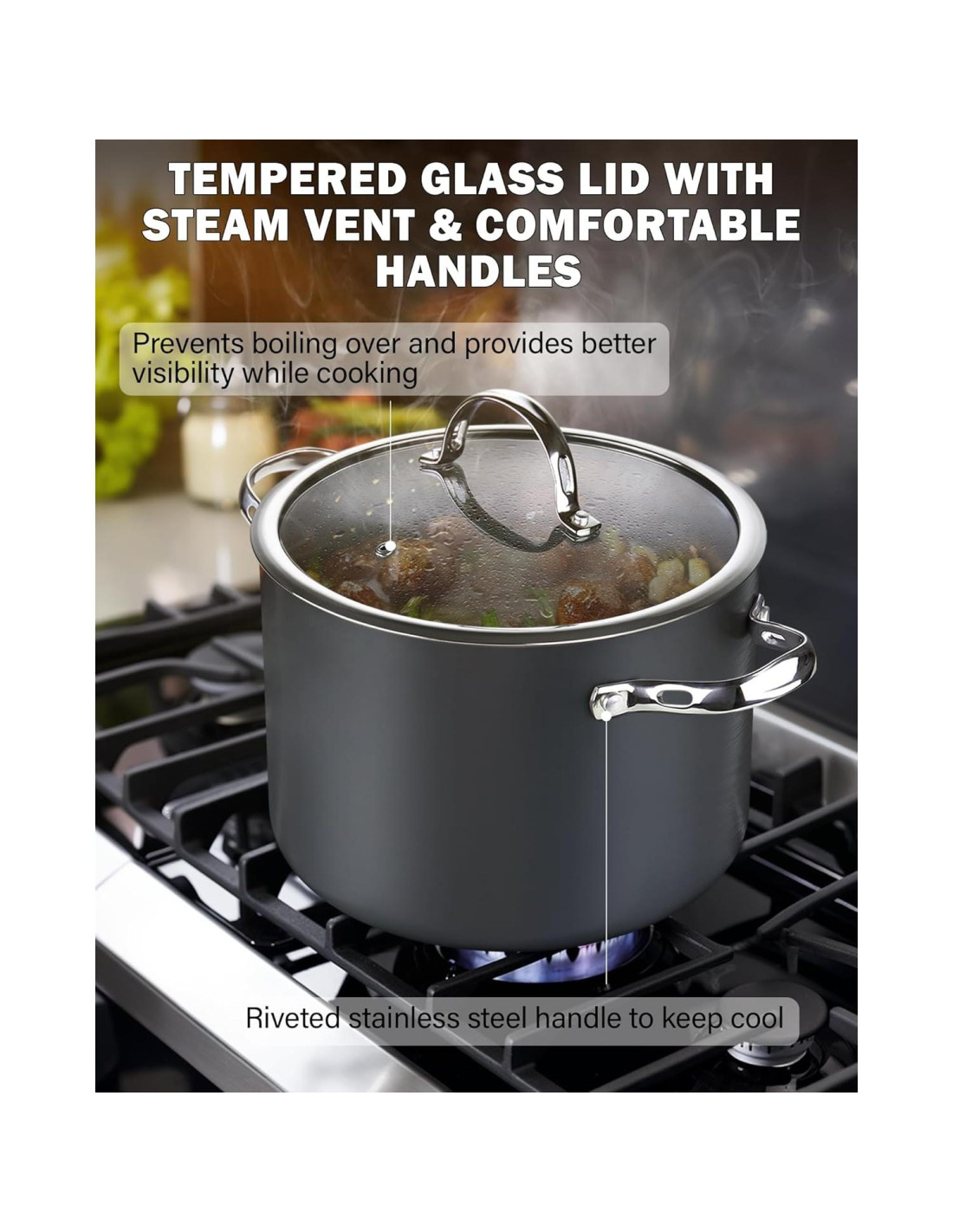 - Tapa de Vidrio y Mangos Cómodos: Tapa de vidrio templado con respiradero de vapor para ver los alimentos mientras se cocinan; Mangos de acero inoxidable duraderos, cómodos y remachados son anchos y profundos para un agarre seguro; Apto para horno hasta 500F (260C), tapa de vidrio hasta 350F (177C)