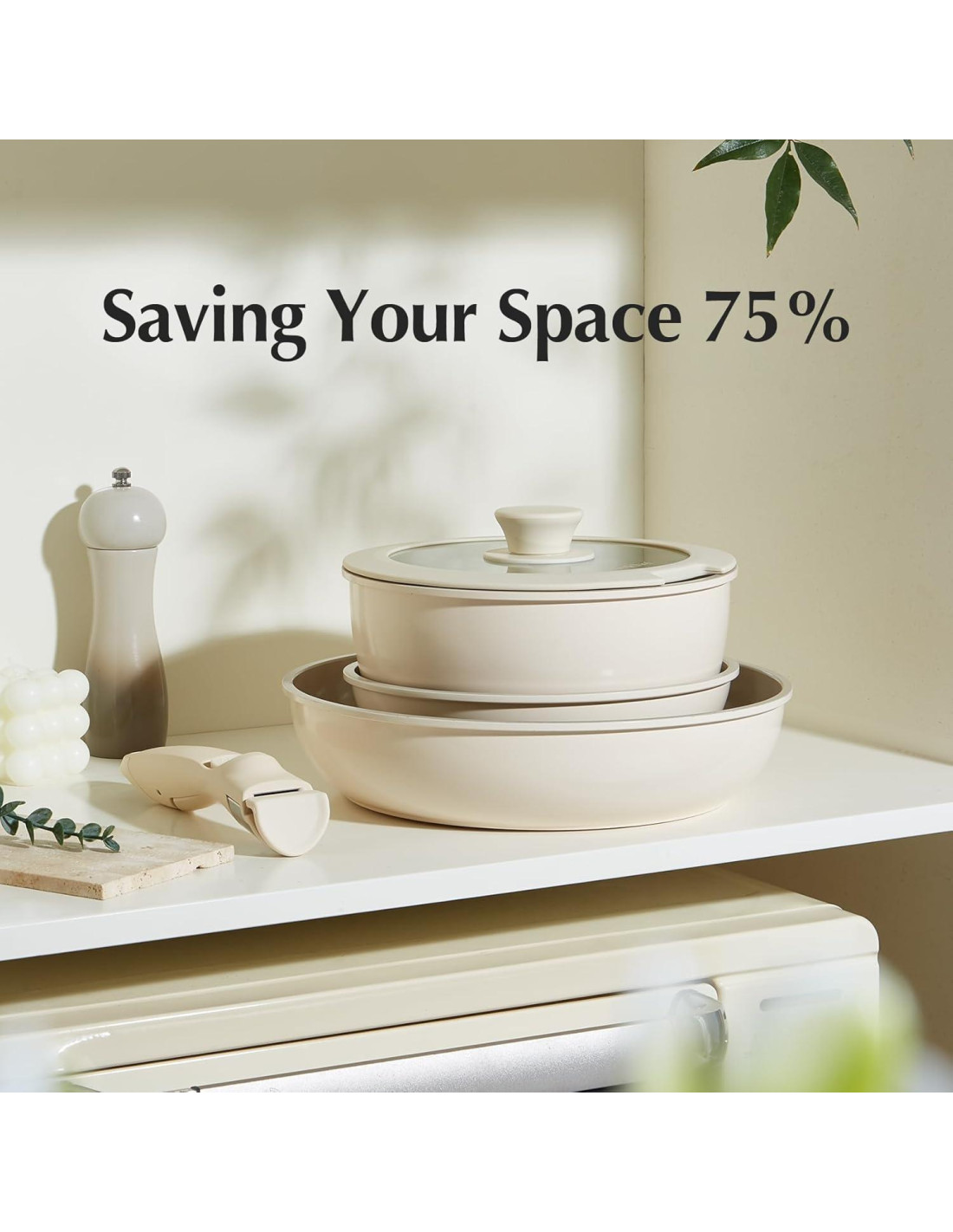 - Ahorro de Espacio del 75%: Ahorra hasta un 75% más de espacio con el juego de ollas y sartenes apilables y mangos desmontables. Apila ordenadamente todas las ollas y sartenes, ahorrando el 75% del espacio en los armarios, manteniendo la cocina organizada y ordenada. Perfecto para cocinas compactas y una opción ideal para casas rodantes o campistas