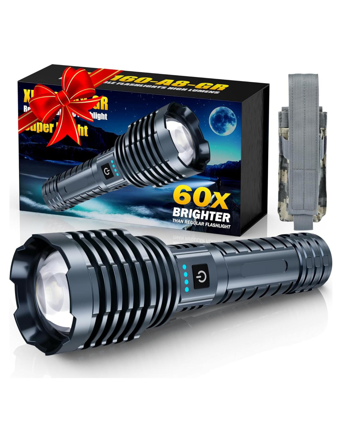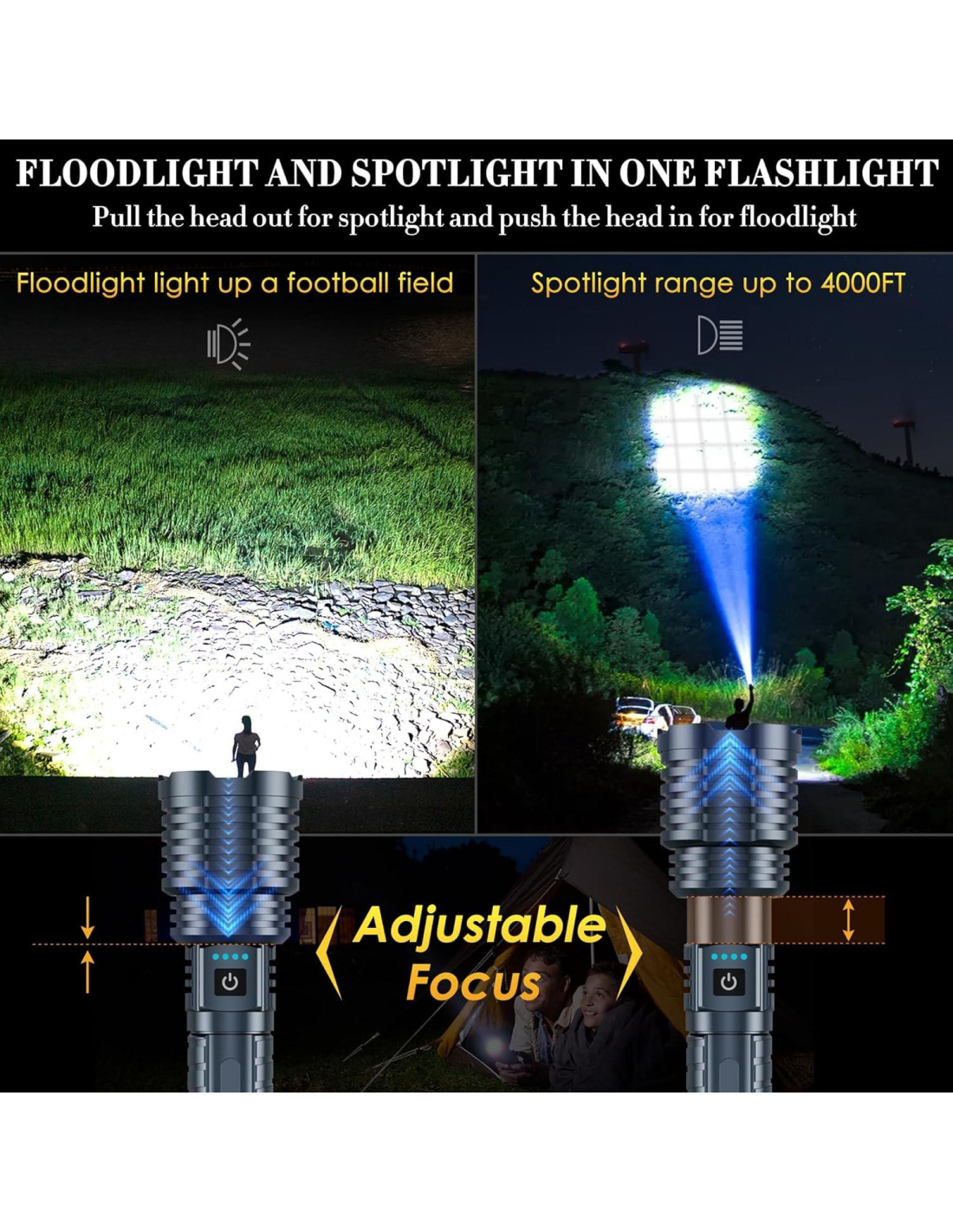 - 2023 Linterna Más Brillante JAMÁS Weoxi linterna LED es alimentada por el nuevo LED XHP160-A8 mejorado, la potencia de salida máxima es de hasta 2400000 lúmenes altos, 60 veces más brillante que las linternas LED ordinarias de altos lúmenes. Y la distancia máxima de iluminación puede alcanzar 2000 metros (6562 pies), podría iluminar un área amplia de 5000 pies cuadrados (464,51 m) fácilmente.