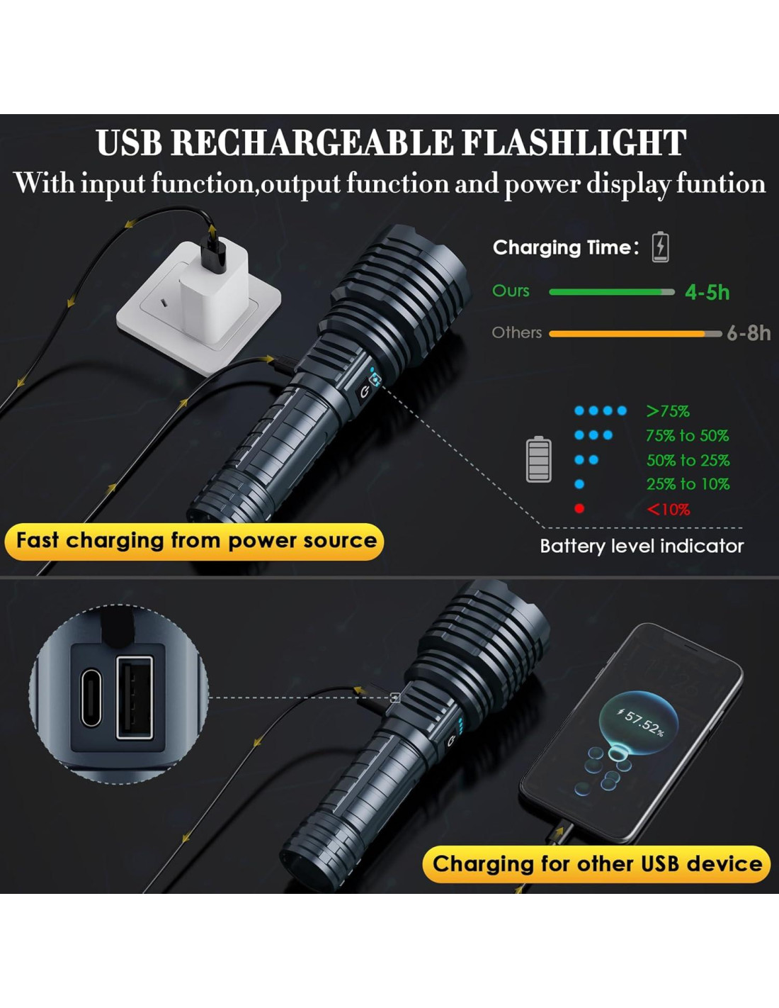 - Linternas Recargables por USB: Esta linterna recargable tiene tecnología de carga rápida incorporada así como función de salida, permite cargar la linterna desde un banco de energía, computadora, cargador de coche, cargador de pared, etc. convenientemente. Mientras que el puerto de salida USB permite que las linternas se utilicen como una fuente de energía móvil de respaldo para tu teléfono y otros dispositivos.