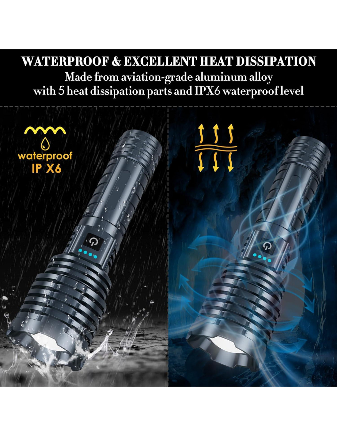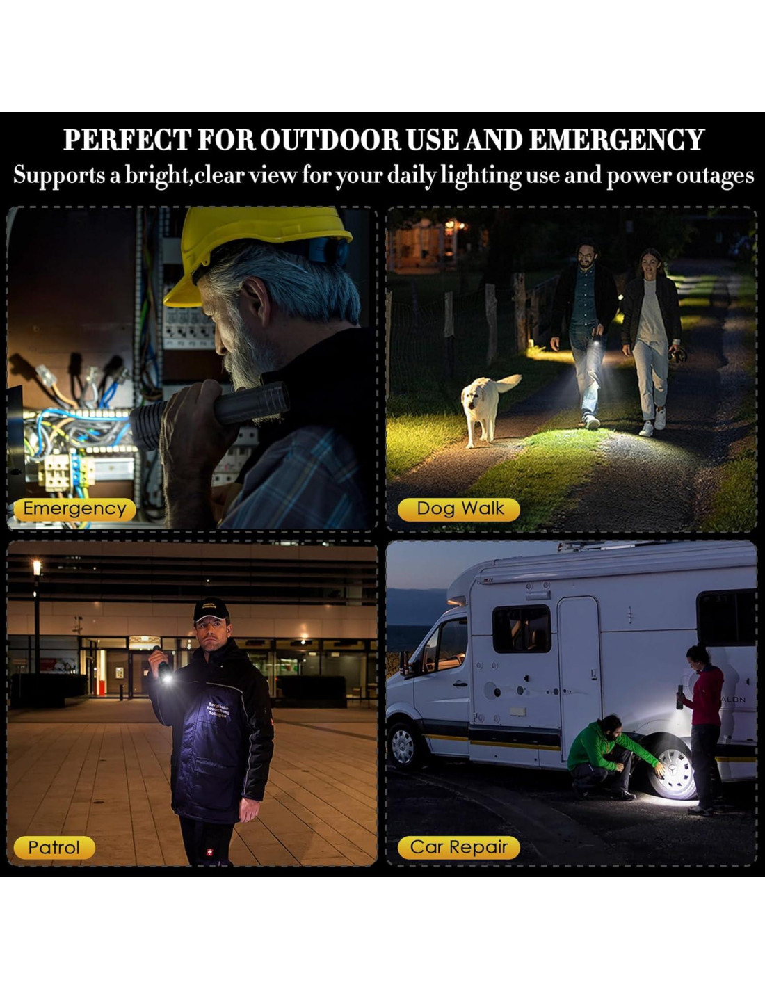 - Adecuada para emergencias, camping y uso policial: Esta linterna de emergencia resistente al agua puede ser utilizada en condiciones climáticas extremas como lluvia, adecuada para uso al aire libre, como camping, aventura, senderismo, pesca, pero por favor no sumerjas esta linterna de montañismo directamente en agua ni descartes la tapa de polvo del puerto de carga, ya que esto puede dañar directamente la linterna de camping.