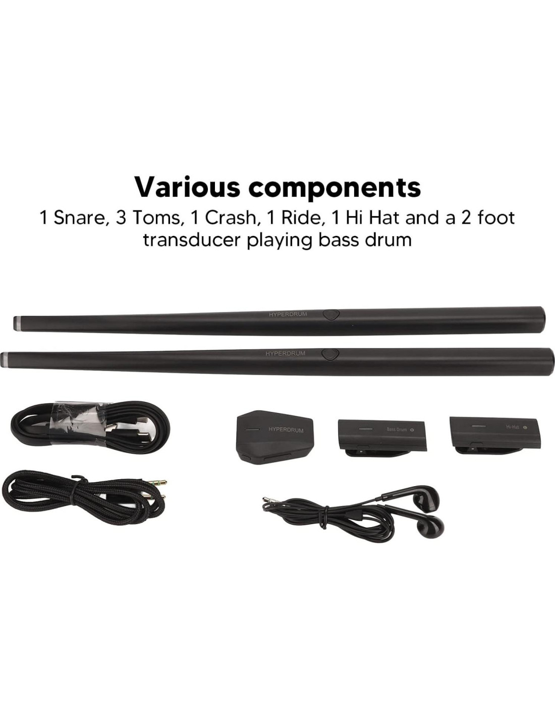 1. Tecnología de Realidad Virtual: El juego de batería electrónica utiliza tecnología de realidad virtual para simular el sonido de varios componentes del kit de batería, incluyendo 1 caja, 3 , 1 platillo, 1 ride, 1 hi hat y un transductor de 2 pies (0.61 metros) tocando el bombo. 2. Compatible: El set de palos de batería de aire tiene una configuración intuitiva que es compatible con sistemas operativos Android e iOS. Puedes conectar las baterías a tu computadora a través de Bluetooth MIDI para hacer música o jugar. Es compatible con GarageBand, Melodics y Logic Pro. 3. Fácil de Usar: No se requiere aplicación, solo asegúrate de que la consola de los palos de batería esté conectada a un dispositivo de salida de sonido (como altavoces y auriculares). El dispositivo de captura de movimiento captura el movimiento exacto de los palos de batería y produce el sonido correspondiente. 4. Sin Ruido: Los rockers y pedales en sí no hacen ningún ruido, por lo que se pueden tocar en voz alta usando altavoces con cable o de forma privada usando la salida para auriculares. Especificación: Tipo de Artículo: Juego de Batería Electrónica Material: PVC Distancia: Aproximadamente 10m (32.8 pies) Interfaz: Tipo C (solo carga) Interfaz de Sonido: 3.5mm Tiempo de Uso: 5H Tipo de Batería de la Consola de Batería: Batería de 80mAh de Ion de Litio (incluida) Tipo de Batería del Palo de Batería: 2 x 200mAh de Ion de Litio (incluidas) Tipo de Batería del Adaptador de Trípode: 2 x 200mAh de Ion de Litio (incluidas) Lista de Paquete: 1 x Consola de Batería 2 x Palos de Batería 2 x Adaptador de Soporte 1 x Cable de Carga 1 x Auriculares 1 x Cable de Sonido 1 x Manual de Instrucciones