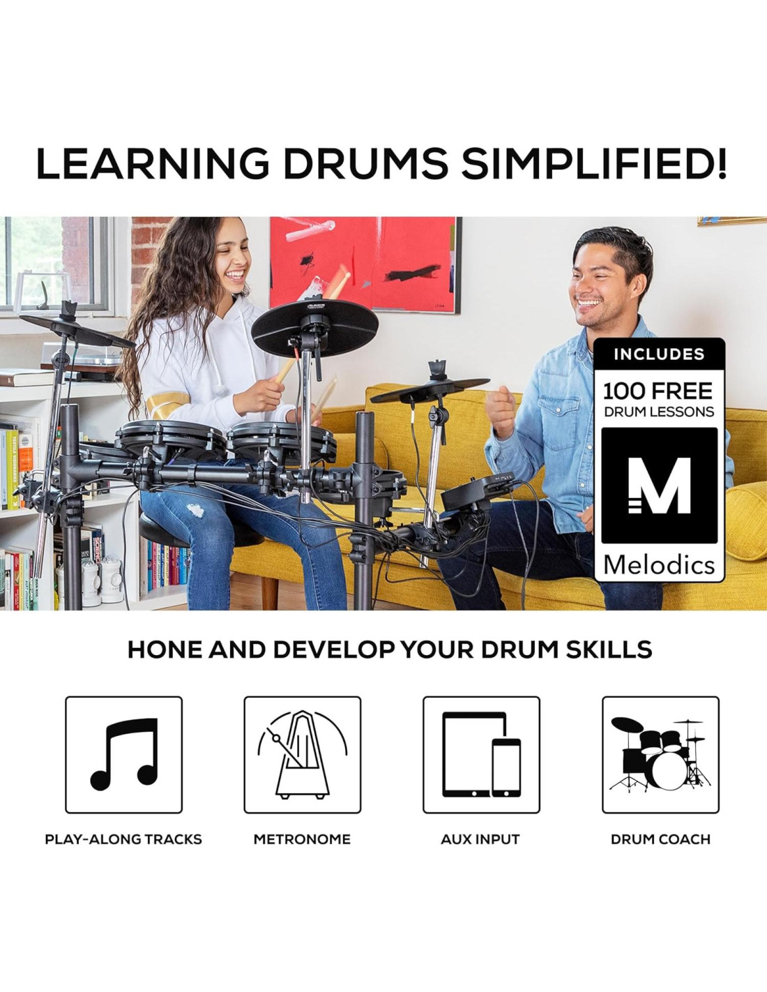 - Lecciones Interactivas de Batería Incluidas - 100 Lecciones Virtuales Gratuitas de Melodics para perfeccionar tus habilidades en cualquier género o técnica que desees dominar