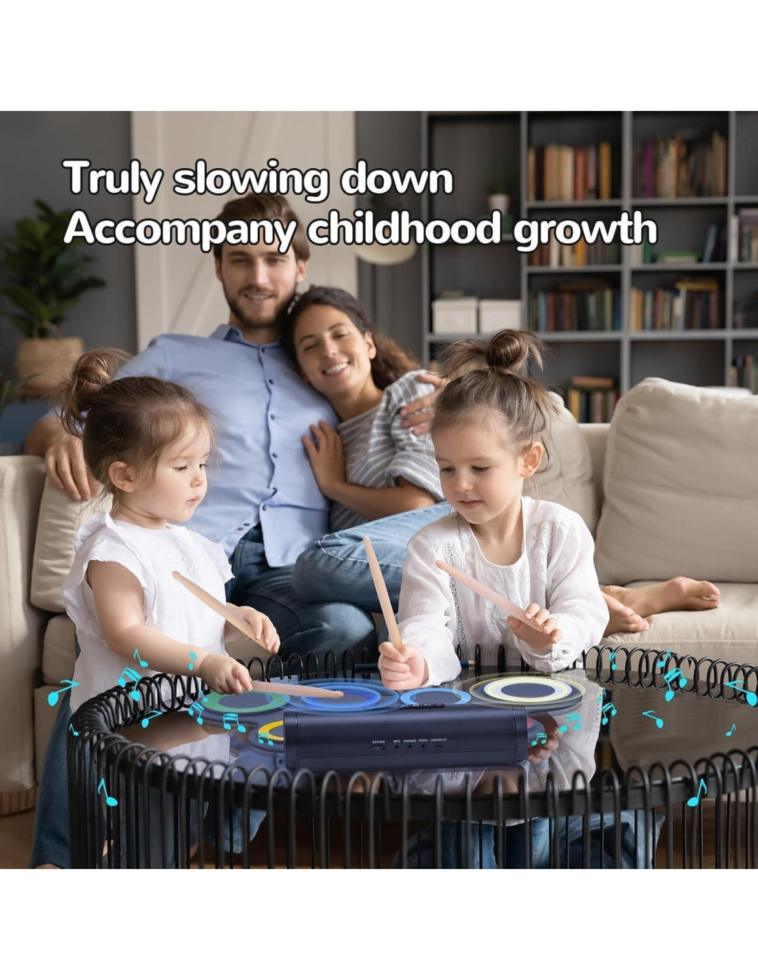 - Set de batería profesional portátil: El set de batería electrónica Iword incluye 1 tambor de caja, 3 toms, 1 platillo, 1 hi-hat y 1 pedal de pie, que puede simular el sonido de un bombo. Este set de batería plegable ofrece 5 fuentes de sonido, 8 canciones de demostración y 3 ritmos, permitiendo la interpretación de diferentes estilos musicales. Los niños pueden llevar este set de batería en sus mochilas al salir.