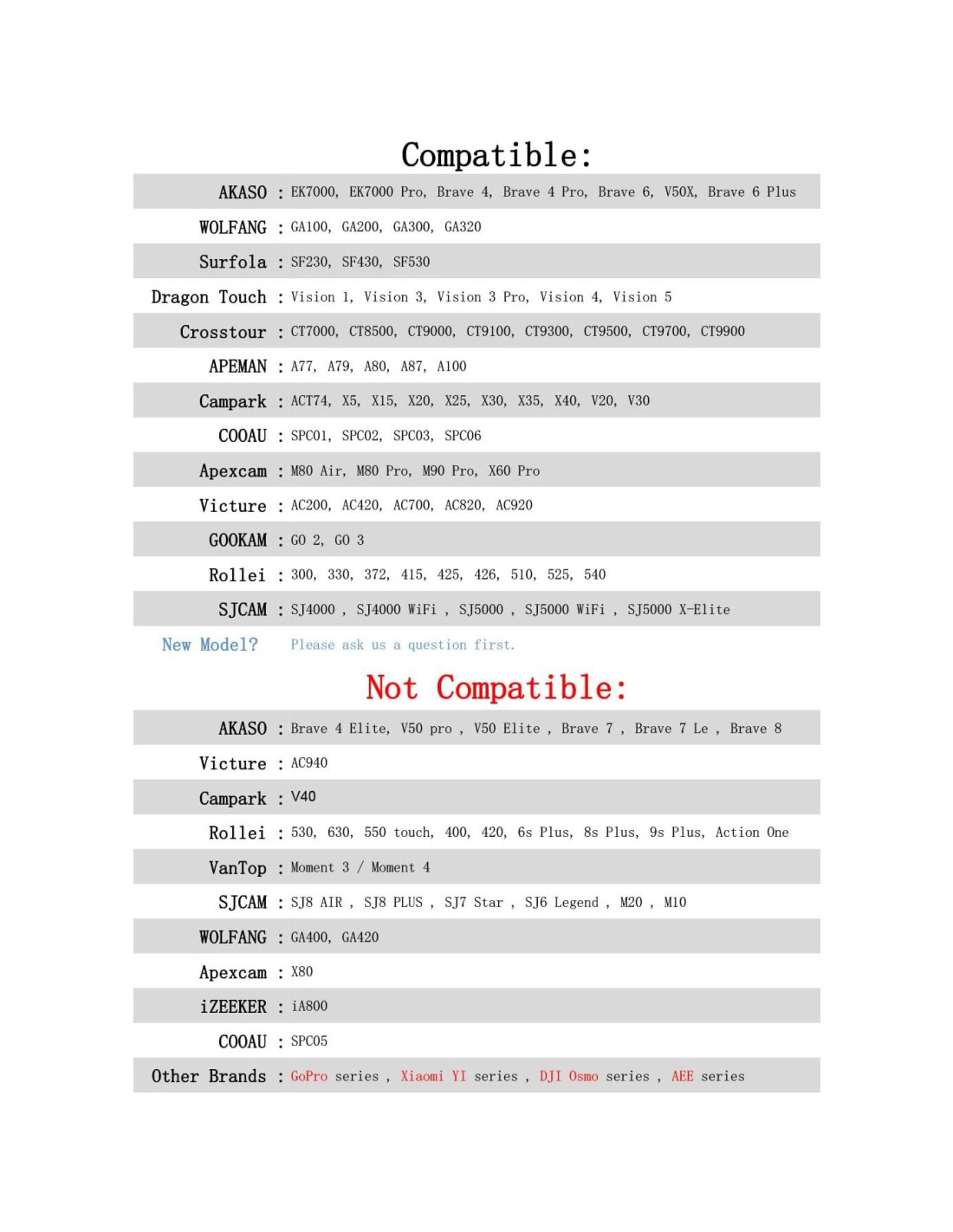 - [Modelos NO Compatibles] No Compatible con AKASO V50 pro/V50 Elite/Brave 7 Le/Brave 7/Brave 8; No Compatible con Victure AC940/AC960; No Compatible con Campark V40; No Compatible con SJCAM SJ8 AIR/SJ8 PLUS/SJ7 Star/SJ6 Legend/M20/M10; No Compatible con series GoPro/series YI/series DJI. (Consejo: Por favor agota toda la energía de la batería antes de cargar por primera vez)