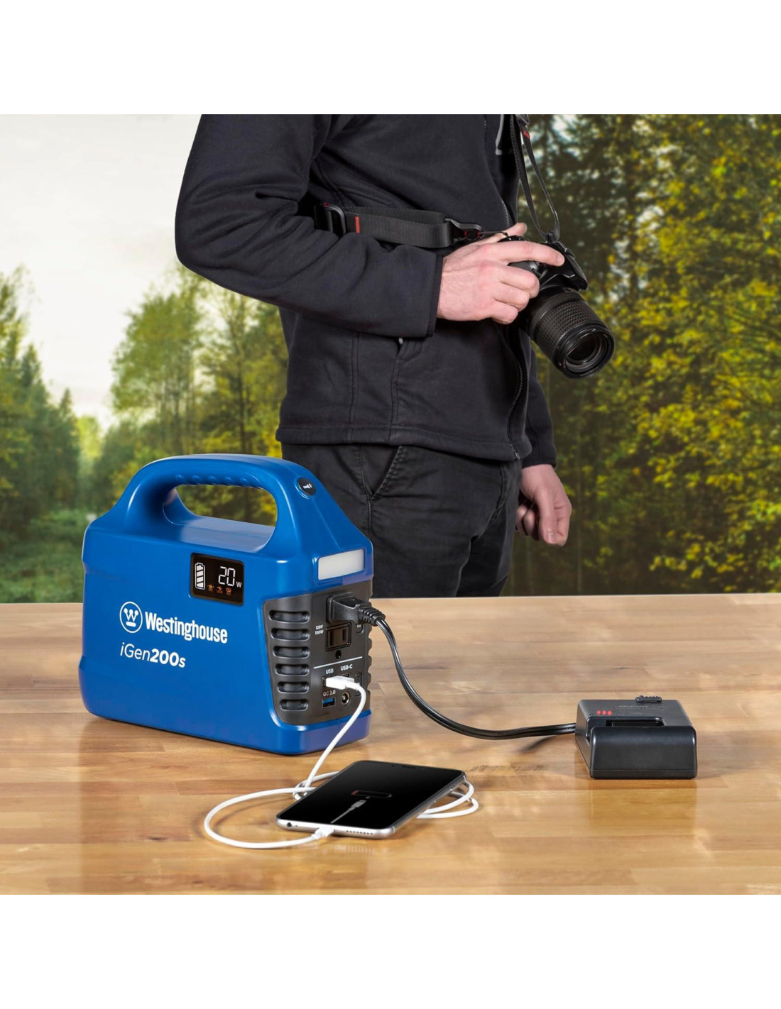La Estación de Energía Portátil iGen200s de Westinghouse es una solución sin complicaciones para tus necesidades de energía. Construida con una batería de iones de litio para energía limpia, la iGen200s no requiere mantenimiento y no produce ruido ni humos para un uso seguro en interiores o exteriores. Esta estación de energía es capaz de cargar con panel solar para una carga ecológica dondequiera que estés. Proporcionando 194 vatios-hora de energía con 150 vatios continuos y 300 vatios picos, está diseñada para alimentar todos tus dispositivos electrónicos necesarios durante todas tus actividades como camping, tailgating y festivales. El panel de control cuenta con tres puertos USB, dos salidas domésticas, una salida de 12V DC y una pantalla LED. La pantalla LED proporciona información sobre la potencia, el estado de carga y la vida útil restante de la batería. La iGen200s está construida con una función de bloqueo para proteger contra el drenaje accidental de energía. Su construcción robusta y compacta hace que esta estación de energía sea fácil de llevar a donde vayas o de almacenar fácilmente cuando no esté en uso. Proporcionando facilidad de uso y un nombre en el que puedes confiar, confía en la iGen200s de Westinghouse para tus necesidades de energía portátil.
