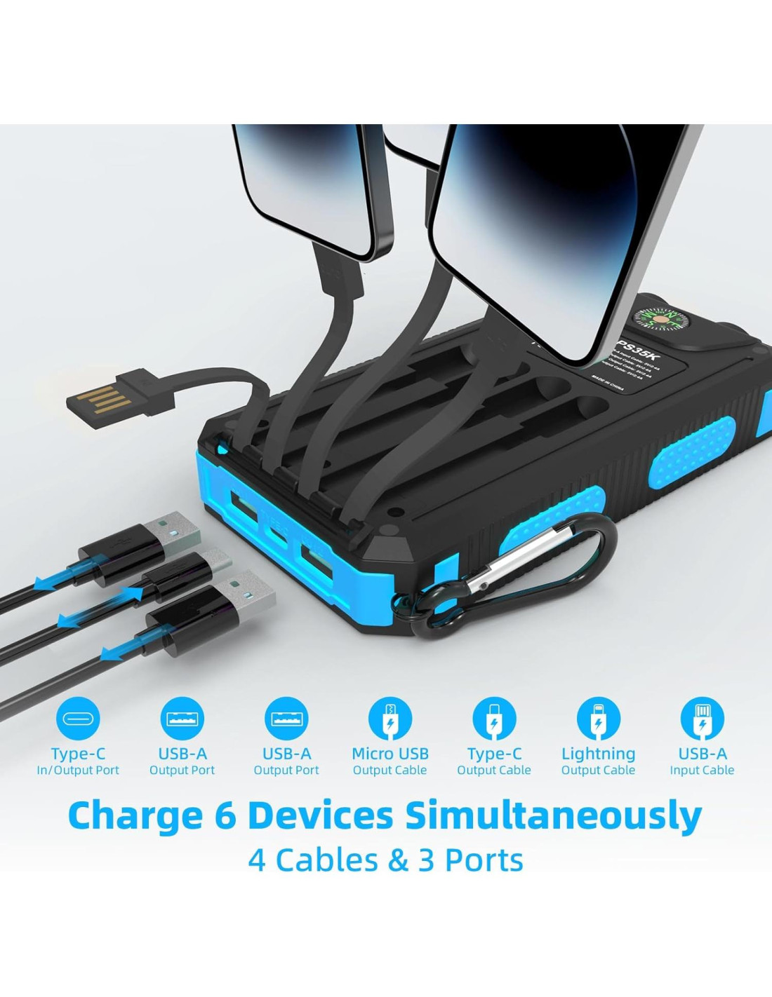 - Carga 6 Dispositivos Simultáneamente 4 Cables y 3 Puertos - Este banco de energía solar cuenta con 3 cables de salida integrados (Tipo C, Lightning y Micro USB) y 1 cable de entrada USB-A, por lo que nunca necesitarás llevar cables adicionales. Disfruta de una carga sin complicaciones en casa, en el trabajo o en movimiento. También tiene varios puertos (Puerto de Entrada/Salida Tipo-C y Puerto de Salida USB*2). Alimentando 6 dispositivos al mismo tiempo, compatible con todos los usuarios de iOS y Android.