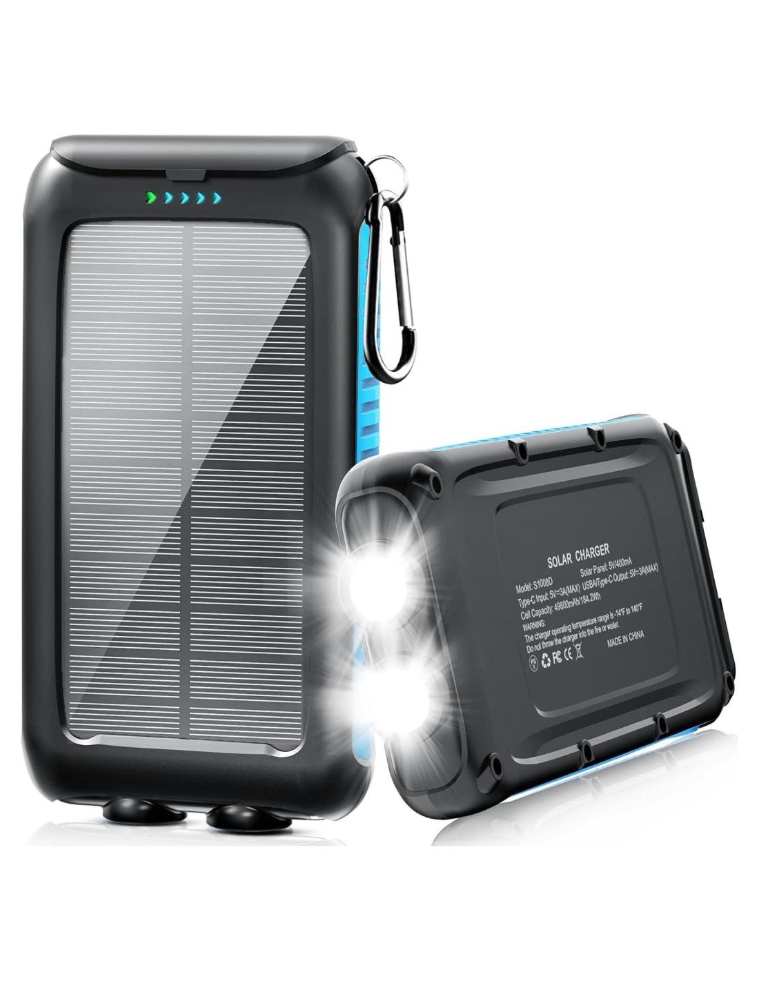 - [Opciones de Carga Dual (USB y Solar)] Este banco de energía solar se puede cargar utilizando un adaptador USB de 5V/3A o luz solar. Nota Importante sobre la Carga Solar: Si bien el panel solar proporciona un valioso respaldo de emergencia, su pequeño tamaño combinado con la gran capacidad del banco de energía (49800mAh) significa que la velocidad de carga se ve significativamente influenciada por la intensidad de la luz solar y la eficiencia del panel. Cargar completamente solo a través de solar puede llevar mucho tiempo. La carga USB sigue siendo el método principal y recomendado para una reposición más rápida de energía.