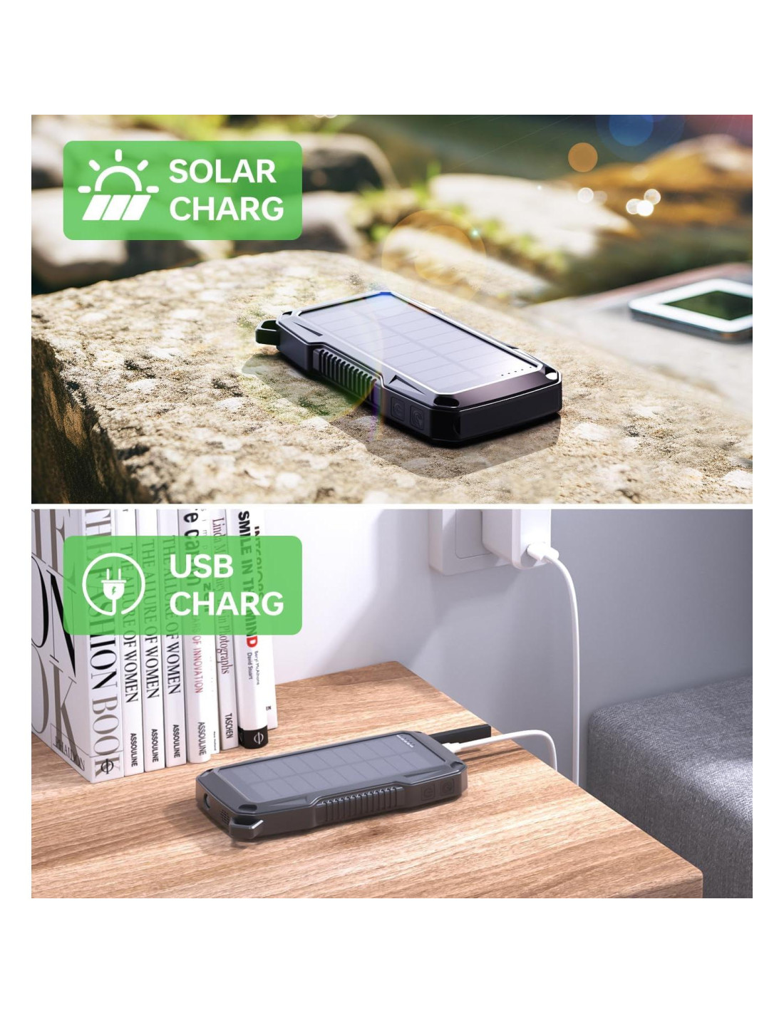 - [Carga Solar para Emergencias] Diseñado como un respaldo confiable, este cargador solar cuenta con un panel solar para mantenerte alimentado cuando estás fuera de la red. Ideal para emergencias durante viajes largos o aventuras al aire libre, también funciona como un banco de energía solar para uso diario. Un imprescindible entre los accesorios de senderismo para hombres, con carga USB rápida para conveniencia diaria.